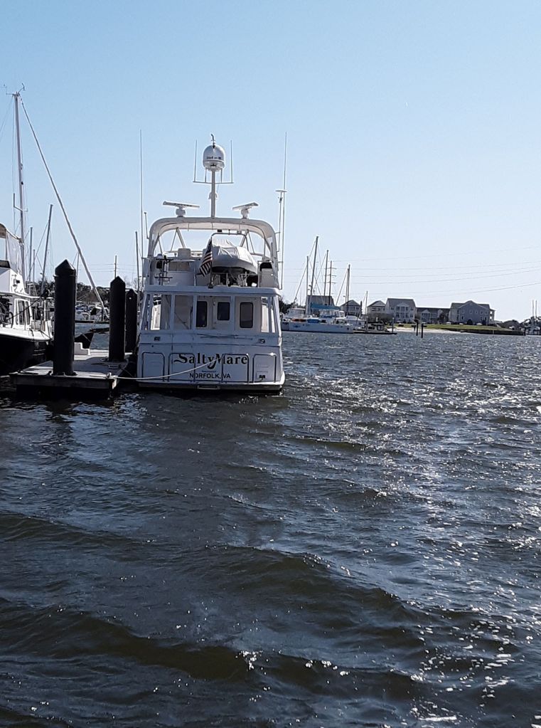 We arrived at Town Creek Marina on April 4 with plans to rent a car to drive back to Virginia the next day for our second Covid shots, to pick up our recertified life raft, and to get our car and shuttle it down the coast to wait for us at Zimmerman Marine Holden Beach. Even though we had a reservation, they had no cars available on the 5th but assured us they would have cars the next morning. The representative called as we were pulling into the lot on the 6th (the day of our Covid shot appointments in VA), to say they still had no cars. Oh, no you don’t. We are not missing those appointments. We’ll take anything with wheels. The manager’s car? A scooter, perhaps? Todd and Susie are getting to Virginia! Well, since we were already there (and gently pitching a fit), they came up with ONE vehicle – a very large pick-up truck. Fine. Keys, please. We’ll take it and leave you to call the other 23 reservations to tell them you have no cars. So, we made it to get our shots, but the life raft wasn’t ready due to some internal corporate office miscommunication on the part of the folks managing Viking Life Raft. Ugh. We got back to the boat with the life raft around midnight (and returned the rented truck on time the next morning, thank you very much – didn’t want someone else to not have a vehicle to go with their reservation).