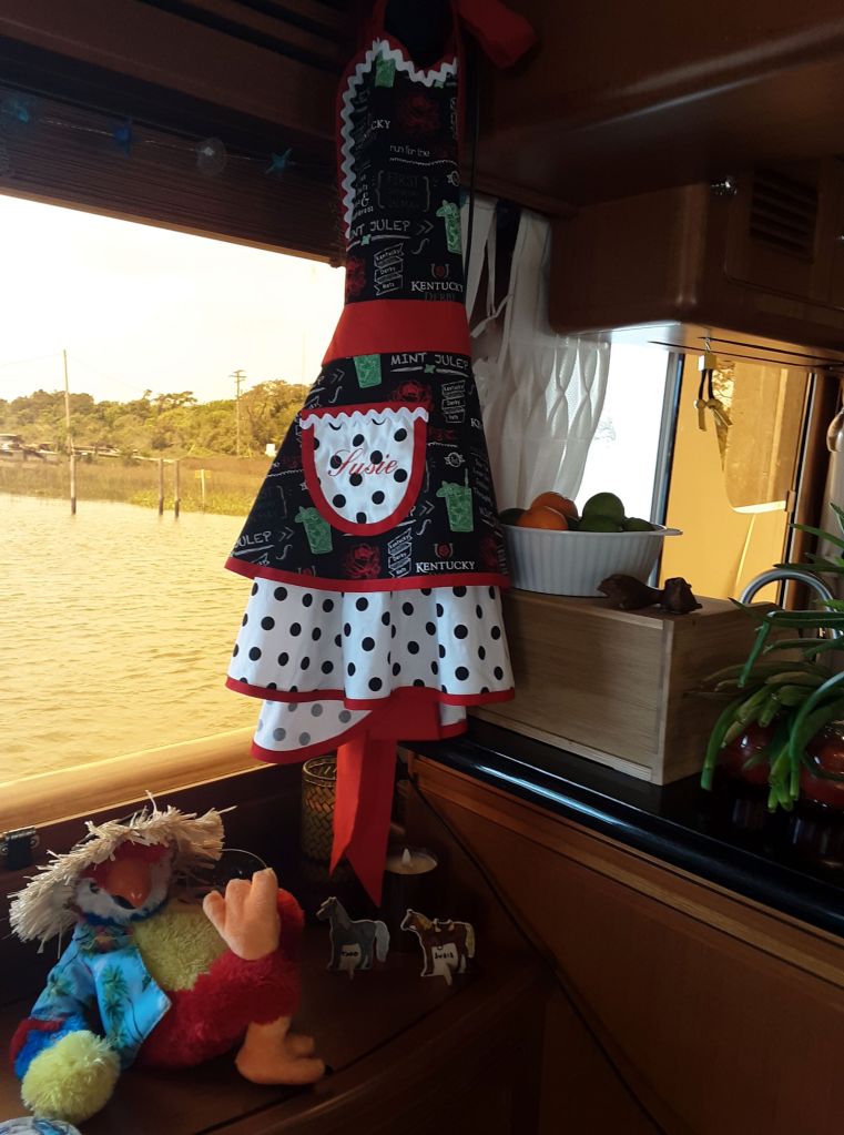 Just because we are currently sitting it out by ourselves in a dusty service yard, doesn’t mean we can’t enjoy the Kentucky Derby, right? At least that’s what we thought. So, the day before, I washed/oiled the galley and salon walls and cabinetry, put out what few small Triple Crown decorations we kept, and prepped for a decadent meal of Kentucky Hot Brown Sandwiches with a Tex Mex Potato Salad (which has nothing whatsoever to do with Kentucky or the Derby but sounded good), and homemade chocolate nut fudge for dessert.