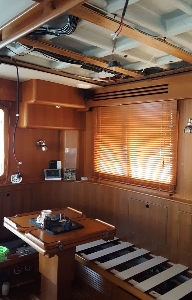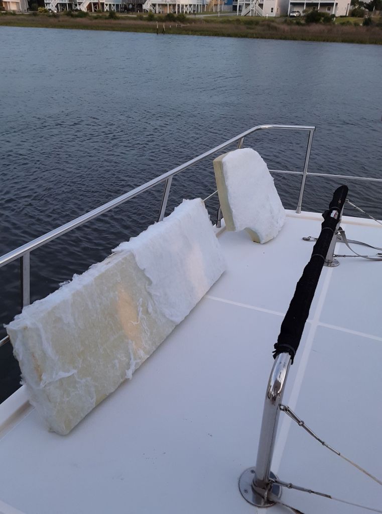 Okay, it was bad. There are seven lines that run from the crane through a cabinet under a built-in seat on the flybridge – a nice, large, empty, fiberglass cabinet. Nothing in there but hydraulic lines. Well, you know how stuff runs downhill? Turns out the lines didn’t burst at the upper end of their runs in the aforementioned nice, large, empty fiberglass cabinet and thus contain the hydraulic fluid. No-o. They burst at the lower end of the lines, which is… wait for it… in the salon ceiling! Hydraulic fluid was raining out along the seams of the ceiling panels in a waterfall directly over the newly upholstered settee!