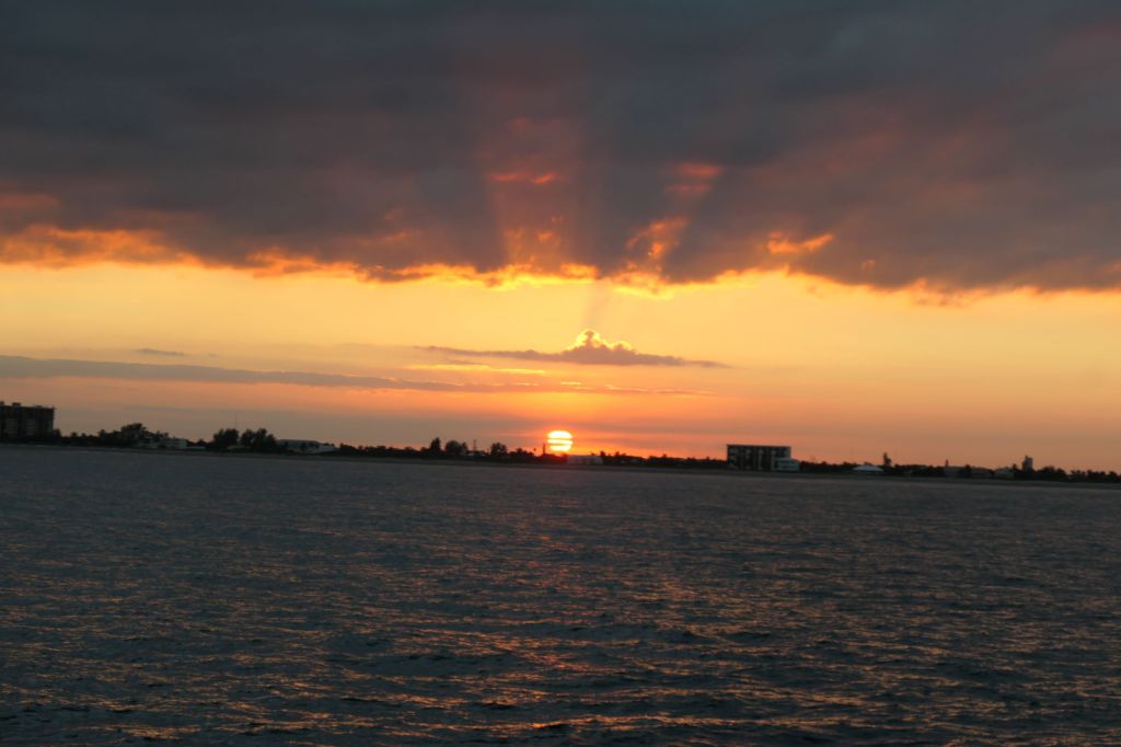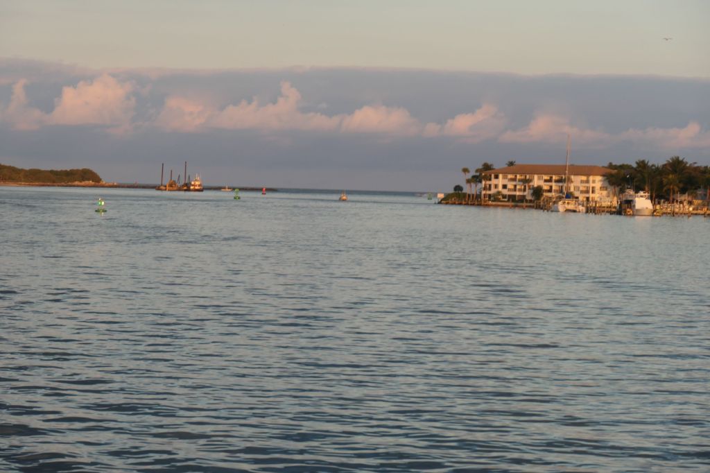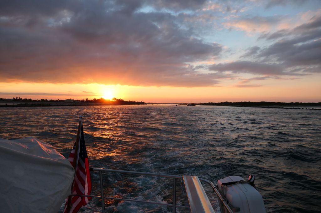 After fueling up at Vero Beach City Marina, we headed out around 3:22pm. Oops, let’s make that 1522 hours for the sailors and military folk paying attention here. My request to the captain was that we hit the inlet in daylight in order to see it and take photos. Man, did he accommodate – our departure was perfectly timed to look back and capture the sunset over Florida.