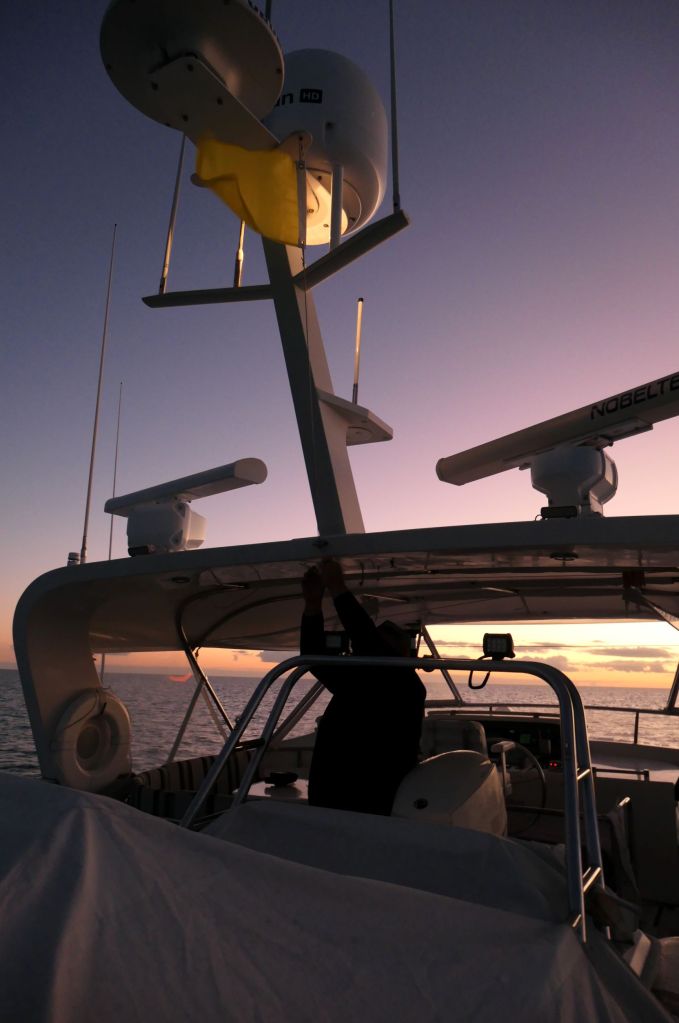 During the past year of outfitting the boat, if things got stressful, I’d playfully point out, “You promised me blue water.” And suddenly, there we were on the ocean blue. Then, it was dark, and darker, and darker. The stars were beautiful when not hidden behind cloud cover, above was clear and filled with the heavens, but to the east (our basic direction) there were clouds moving around all night. So it became difficult to distinguish the horizon in the inky blackness. To the west, the lights of South Florida made it clear we were headed on an adventure. We kept a watch on instruments, course headings, GPS, looking for lights of other vessels so we could identify them and their distance on radar and/or AIS, etc. Did I mention it was very, very dark? We could look down as our wake disturbed the water, and it absolutely sparkled with bioluminescence – beautiful blinking points of light on the water’s surface. Cool! We took turns on watch, but truthfully, we were both almost too excited to sleep, so the naps were brief, more like power naps. We spent most of the time together on the flybridge.