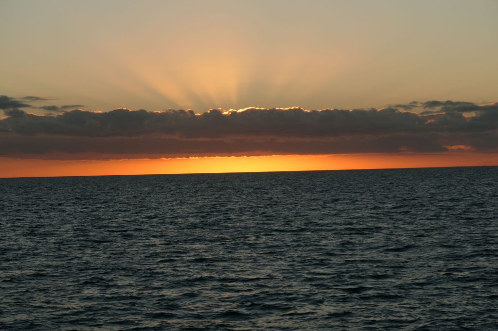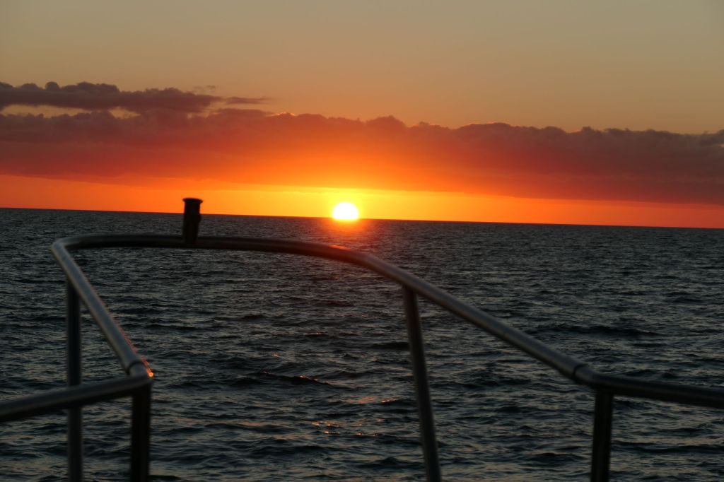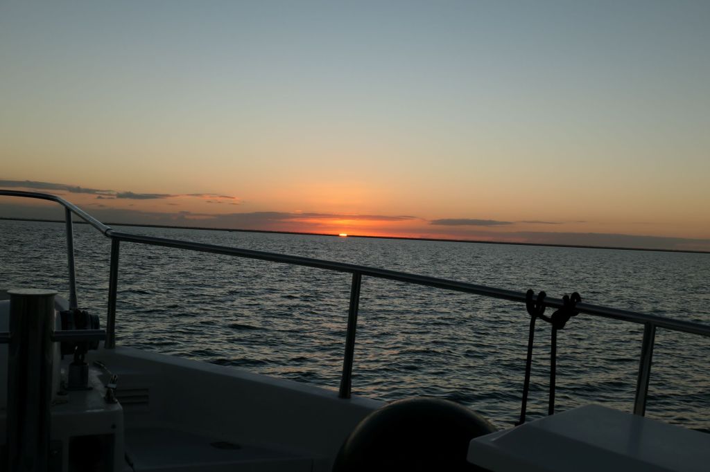 Around 0230, as we scanned the horizon, two points of yellow light appeared. What’s that?? I got my binoculars, handy 1st mate that I am, to identify it. A few seconds later, we were looking at a perfect Cheshire Cat of a crescent moon, as it seemed to POP into view. Hey, where have you been? We laughed at ourselves and from there followed the perfectly illuminated path to the Bahamas. Silly camera can’t take a steady shot in the dark on the ocean.