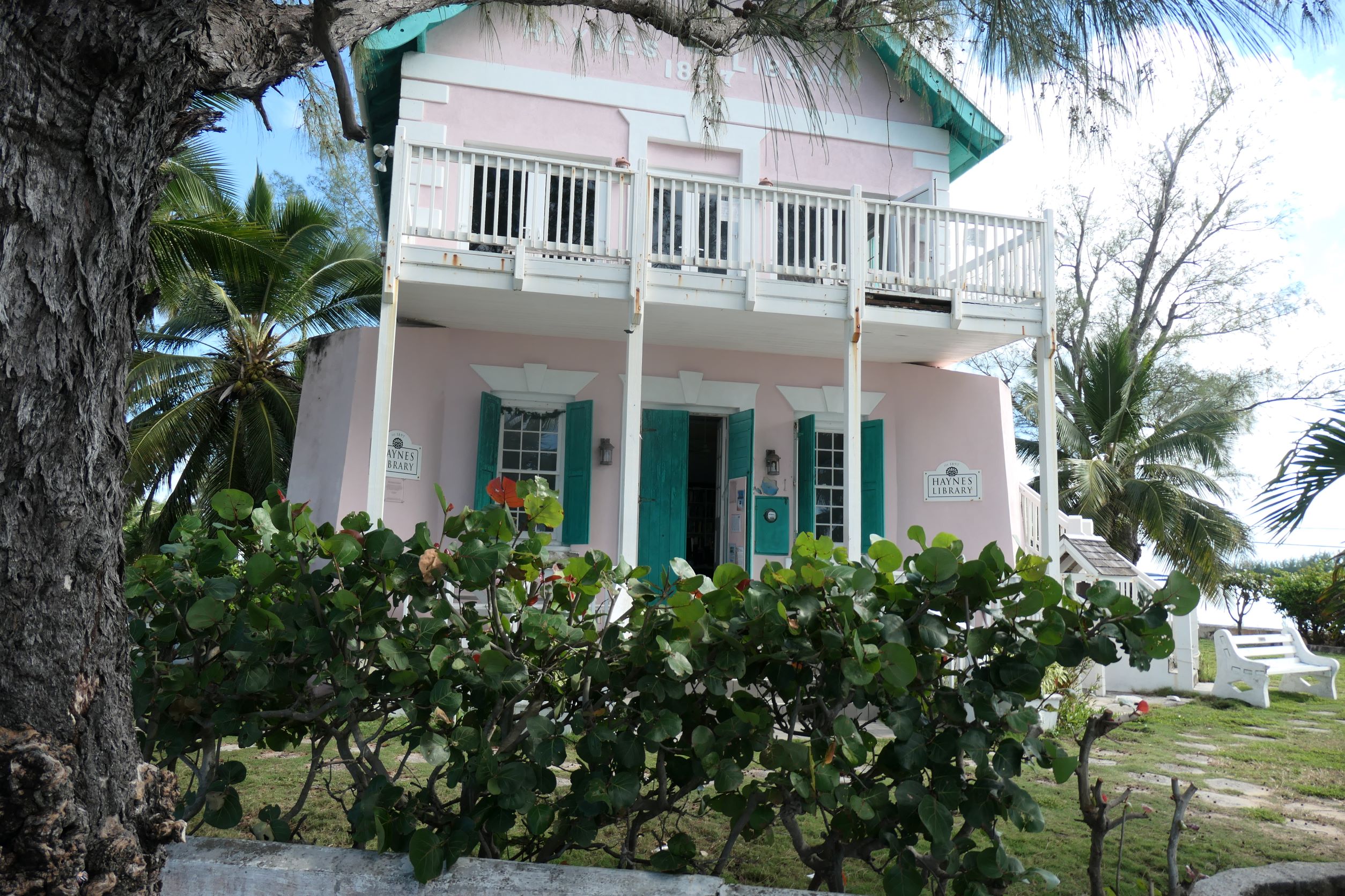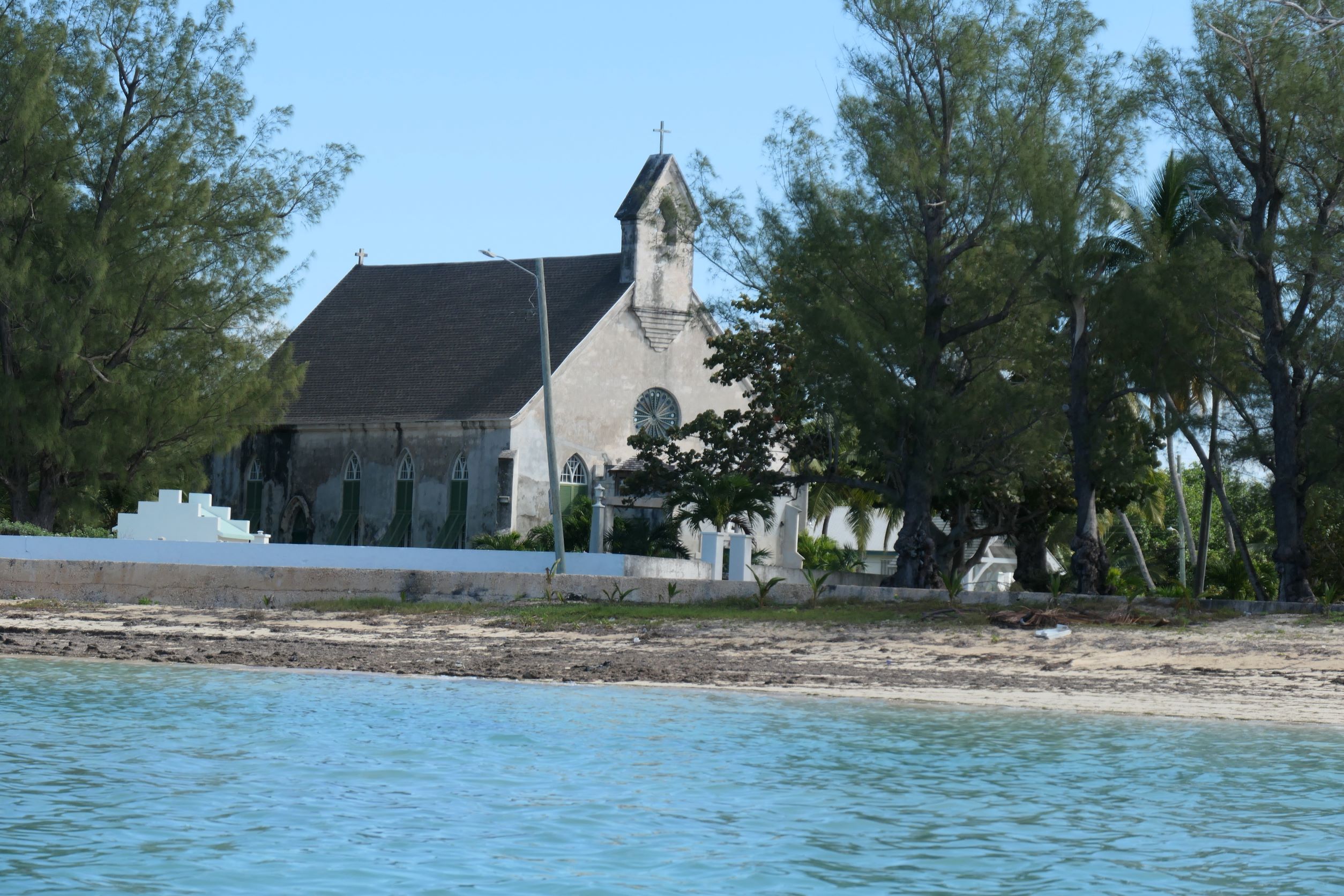 In the middle is the pretty pink library (est. 1897) and the beach in front of the church where we can land the dinghy. With so much in sight we just had to dinghy to the beach to explore the town. Quick explanation for the landlubbers: the dinghy doesn’t come up onto the land. We can “beach” it, but with the engine, it’d be too heavy to drag back to the water, so we anchor in very shallow water (planning ahead for what the tide’s going to do), climb over the side and wade ashore. Makes the clothing and shoe issue kind of tricky.