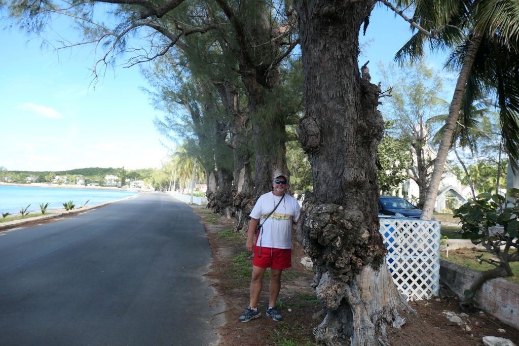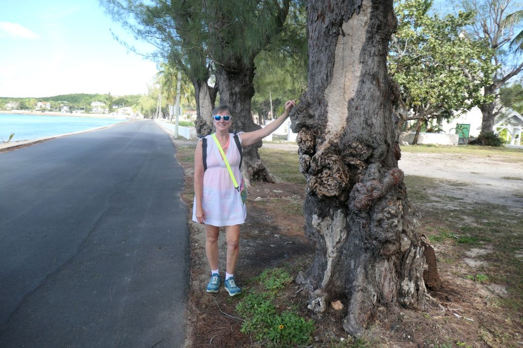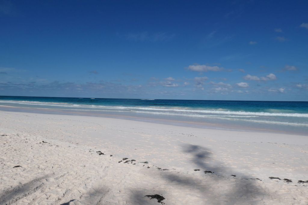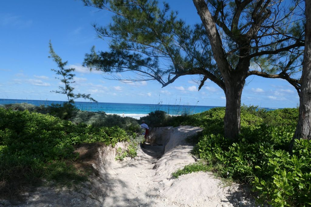 Since we got a “retired cruisers” start, i.e. 11am, we asked a few locals sitting on a bench near where we splashed ashore just where we should go for lunch. Ronnie’s, it is! Ronnie’s little dive bar/ pool hall/ humidor and eatery opened in 1957 and serves simple fare at fair prices. Unfortunately, they were out of conch, grouper (out of season), and salmon (uh?). Not a salad in sight! So, easy choice, a cheeseburger and a Philly, please. During quick chats with the friendly folks in the place, we learned that everyone has a nickname. Quincy (real name) the bartender introduced us to Breez the regular, who gave us great tips about exploring the area and even offered to call his friend Buff, the “local Uber,” to drive us around. We needed to stretch our legs so opted to walk, following Breez’ excellent directions, over to the Atlantic side to hopefully see the pink sand beach.