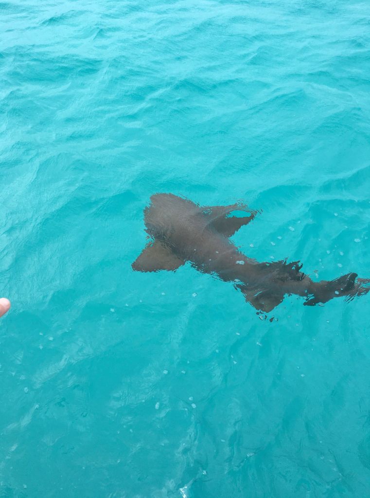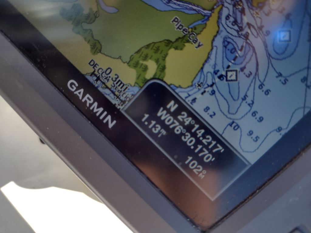 Where we anchored Saturday night on the west side of Pipe Cay turned out to be quite rolly (is that a word?). There were five sailboats and a cat in there with us, all bobbling. Although the winds were predominantly from the east, there was a swell coming from the south that wrapped around the point to hit everyone broadside. So, in the morning, we launched the dinghy to scout out a new location. Just as soon as the dinghy splashed into the water, a nurse shark showed up to check it out. I’d already put the camera in the dry bag, so Todd quickly grabbed the phone to capture the image below before the about 5-footer lost interest and lazily swam away. After exploring the nearby cays, circling, and reading depths, we found our new spot and dropped a pin on the Lat and Long. Time to go get the SaltyMare.
