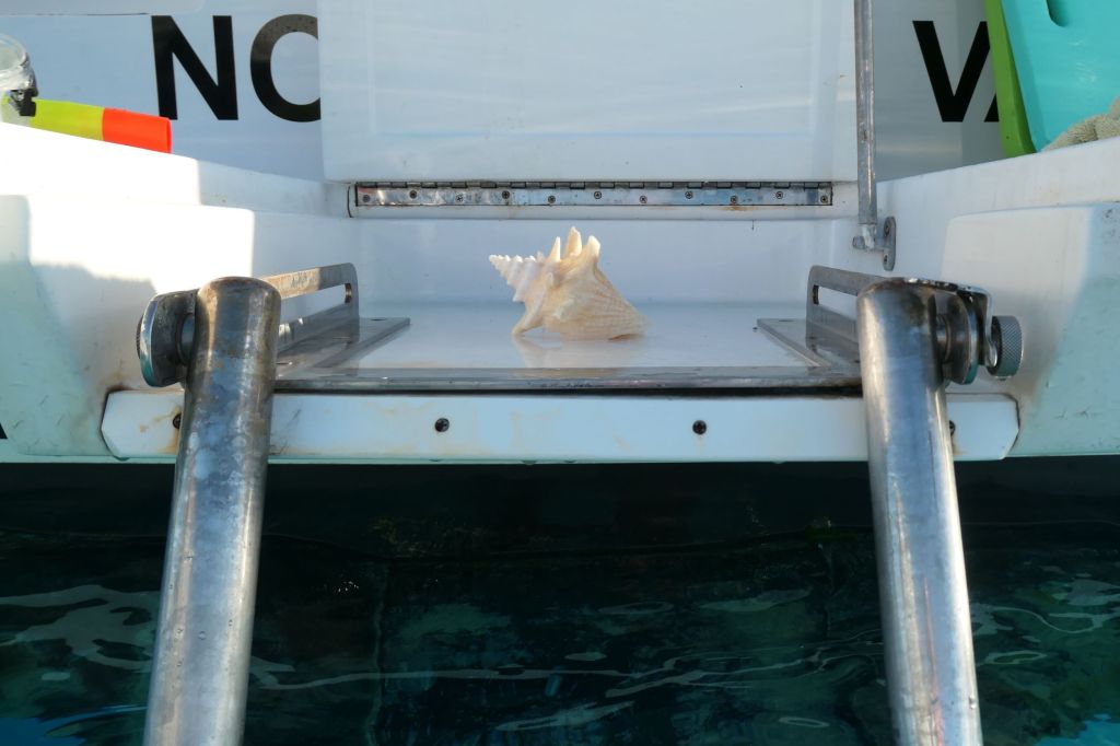 But, actually, I have to end this post with a different tale. We took advantage of the slack tide to swim and snorkel in our beautiful little anchorage. When I tired, I enjoyed one more lap around, then headed to the swim platform ladder, past the lone little fish still hanging out back there, and popped my head up out of the water to find…a gift. I felt like a school girl who’d just been presented a flower. What a fun surprise!