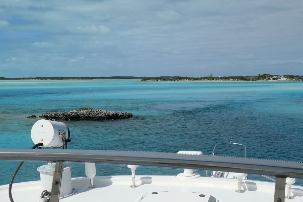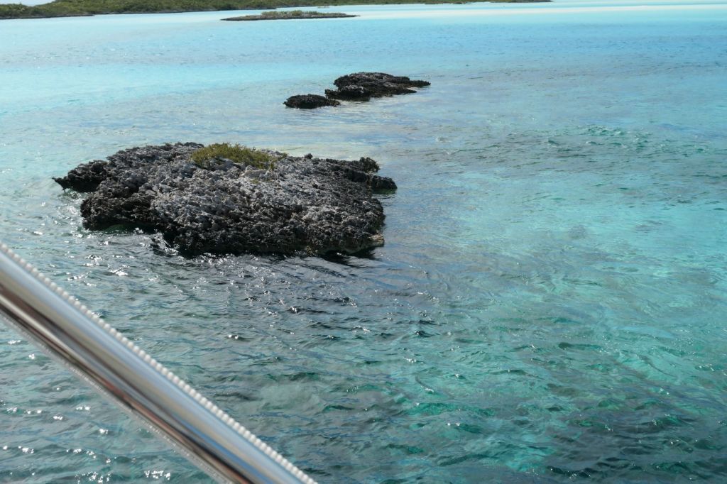 The new location was not something we ever would have chosen based on charts or VPR (Visual Piloting Rules), i.e. use your eyes. The color of the water and the currents tell you a lot, like hey, knucklehead, don’t go there, etc. But we had carefully charted out a path in the dink and confirmed it on the charts once back aboard the Mare. Time to put on our big-boy trunks and be brave. We followed the deeper blue path to a small opening that crosses a layer of submerged rock to the right of those visible in the distance. Yes, rock.