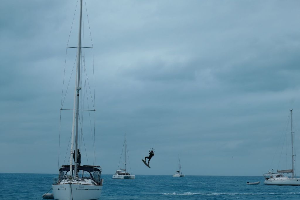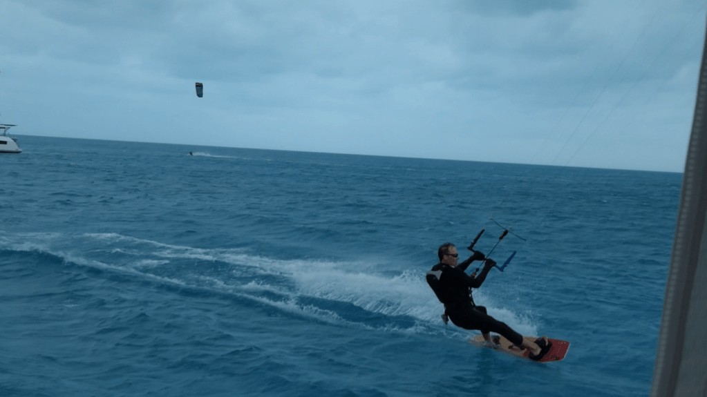 John Anderson’s tune “Swingin'” came to mind over the last few days. My goodness, not sure exactly how bad this cold front was for y’all as it moved through the states, but Lordy, its been a doozy down here. Three days of constant, I mean constant, wind over 15 mph, gusting to more than 30! We are safely anchored and “just-a-swingin'” with numerous other boats in Little Bay off Great Guana Cay. While most of us hunkered down to wait for the winds to pass, a couple of kiteboarders took advantage of the wind for a bit of sport.