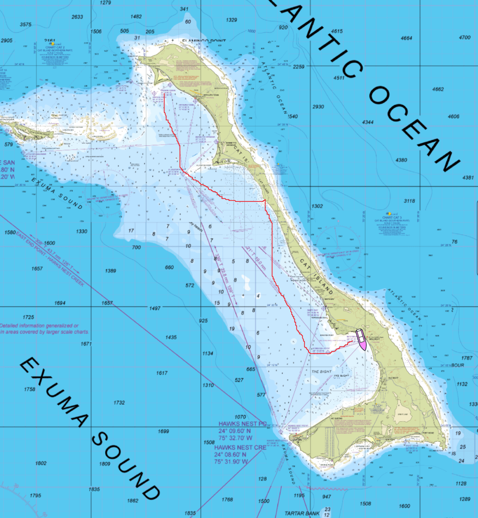 Cat Island is also the home of the tallest point in the Bahamas! Mount Alvernia, at 206 feet, and it has a special place perched on top. We are looking at it as we sit at anchor right here in New Bight, but that exploration is for another day. Can we go yet? Come on, Honey. Let’s go!