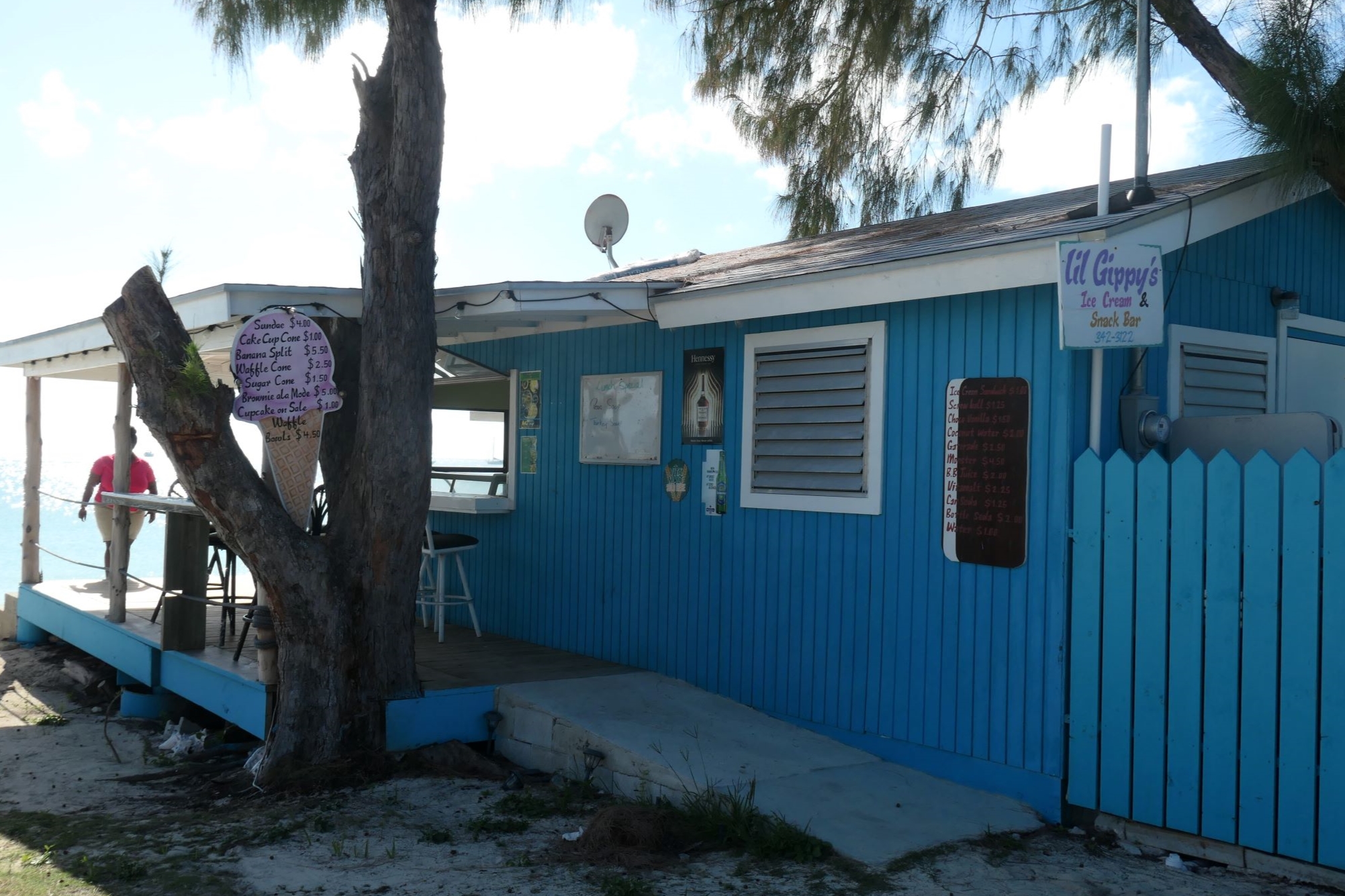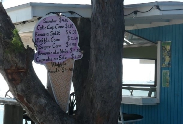 As we said, we are always weather-watching, and all of our various weather sources (we use five different ones) were predicting sustained winds of better than 15 kts with gusts beyond 20 starting Wednesday. Rats, Dave and Peggy were going to stay in Rock Sound, Eleuthera, and given the “sporty” forecast, I guess we would hang right here. Wednesday comes and, oops, it was a great day, sunny and beautiful with mild winds. So, back to lil Gippy’s for more ice cream before the “blow” was to now start the next day.