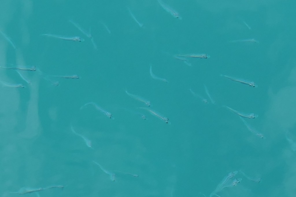 Good but eventful cruise. Once anchored, we settled in and slept very well, like in the bed, heads at the head of the bed! In the morning, we awoke to find a large school of baby fish – hundreds of them – hanging out behind the swim platform, where they stayed most of the day laughing at us – they’re fish, after all. No idea what they’ll grow up to be, but they were shiny and cute. After some mold-killing chores, the day ended with a pretty but somewhat brooding sunset. That’s excitement on the SaltyMare.