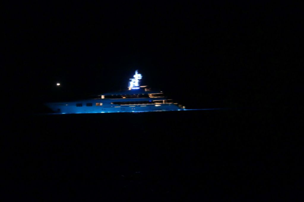 The anchorage at night with these big boats is fun because most of them leave a lot of lights on. We tried to capture Carpe Diem, but it’s hard to take a low light shot of a bobbling object from a moving platform.