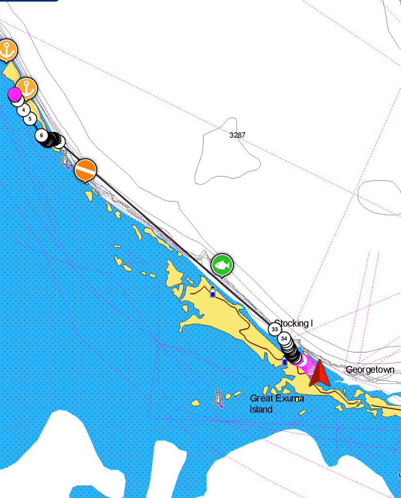 We planned to move a bit south down the island to explore, but it was such a beautiful day, and when the SaltyMare gets a-going, well, she just likes moving along. While underway, we thought, “what the heck, let’s go outside and cruise down to Elizabeth Harbour near George Town.” Wait, what? We’ve been avoiding that. But everyone says, “you gotta go sooner or later.” Not to mention, we’ll go right past “that spot” where “everybody” catches fish, “I mean everyone!” So after some tight squiggles to get through the Galliot Cut past High Cay, we entered the Sound for the run down the Exuma islands chain to Great Exuma.