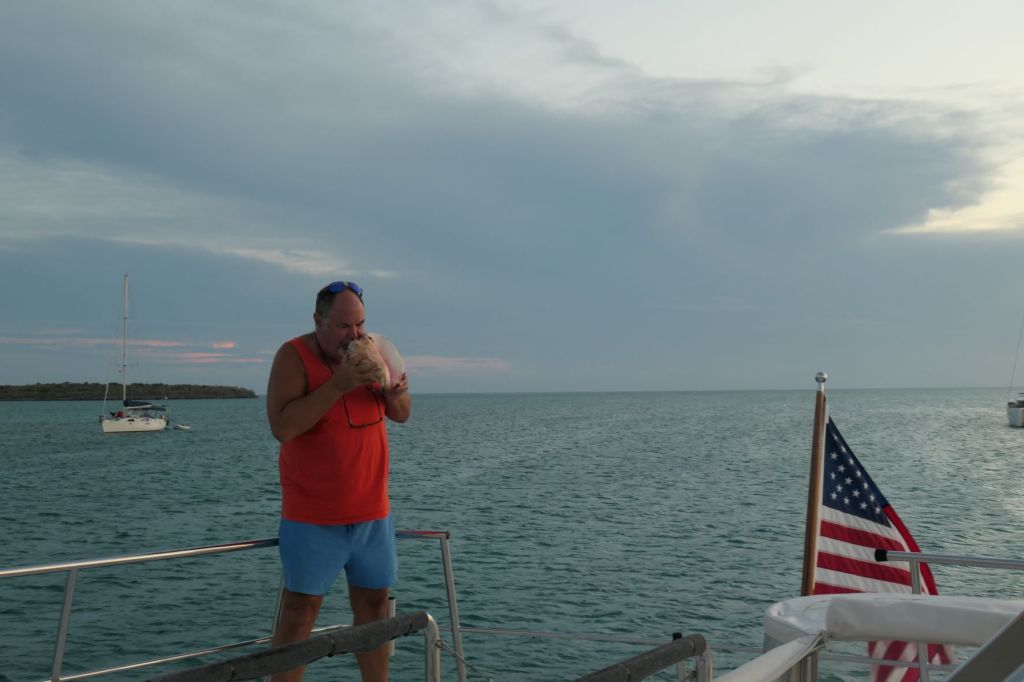 Next day, it was a bit like our friend Peggy on Simplicity says, “Groundhog Day.” After a leisurely morning, we washed the main deck of the boat, the and house, and the hull to the lower rub rail (in other words, the rest). Later we did go over to the Tiki Hut to meet and greet 4 of the 5 couples in the anchorage. We never saw anyone from the one sailboat that left the next day.