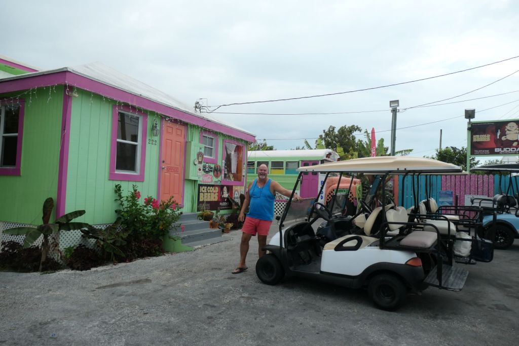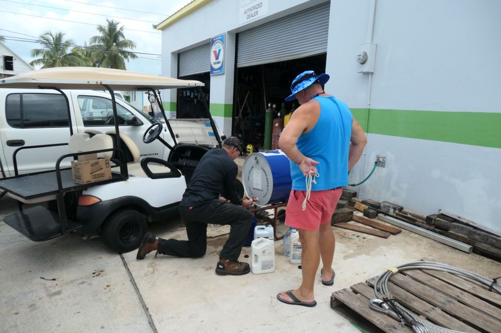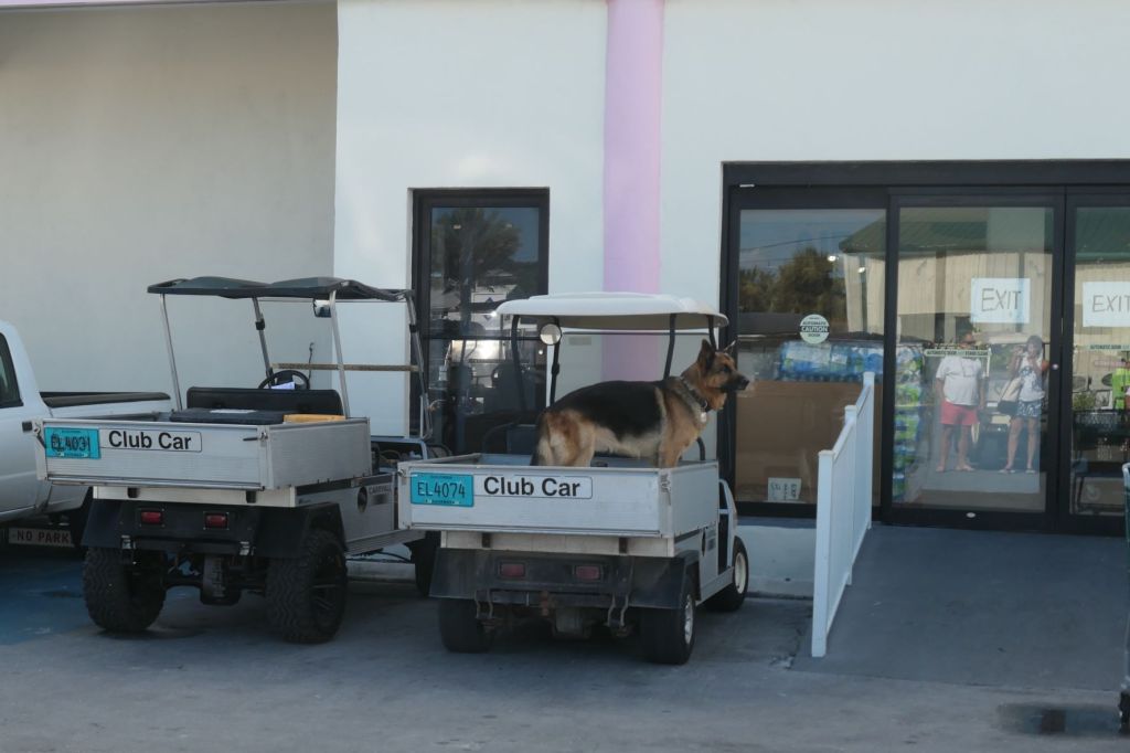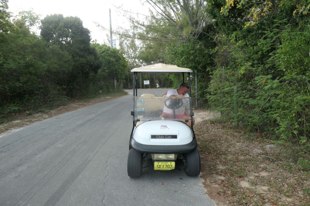 We were told we need to call Herbie, who now works at the electric company. Unfortunately, Herbie couldn’t get away Friday but might be able to make it Monday. Shucks. Well, since Susie, although on the mend, isn’t quite back up to snuff for the shoe leather express, we rented a golf cart for a couple of days to bring supplies back to the boat and explore. So, after dropping off the oil, we went back out for a bite.