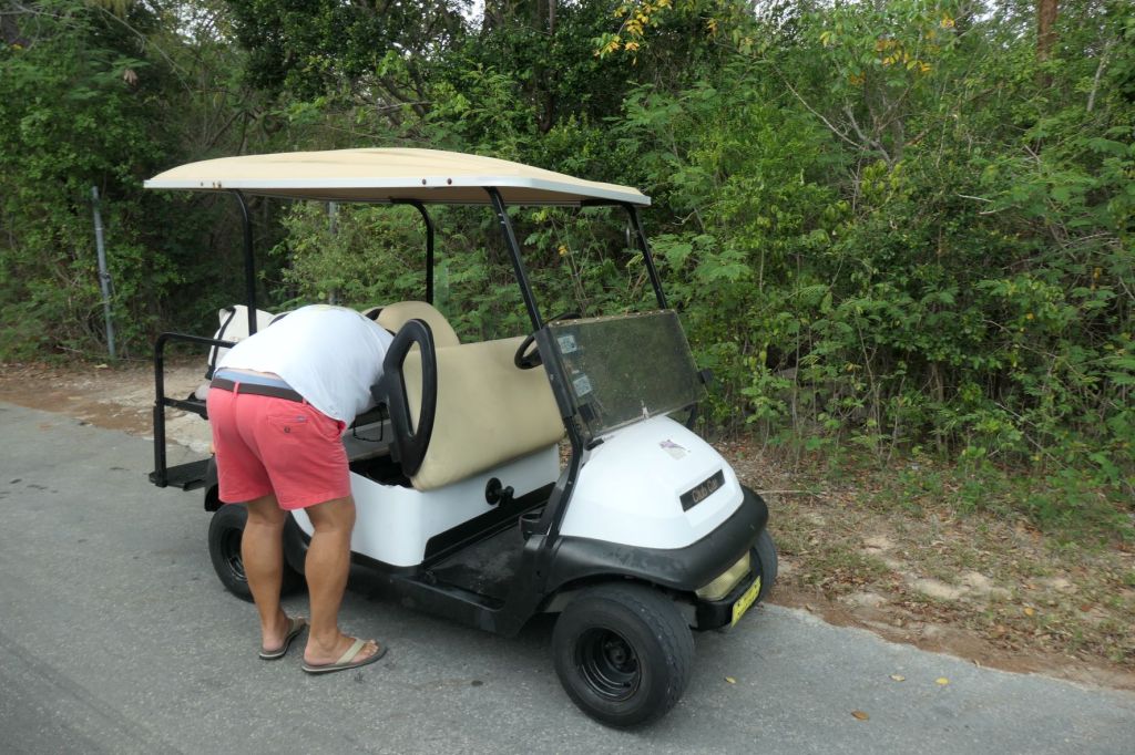 Call to the marina – they send someone out – we pass him on the road because Todd (the in-house mechanic) got it started – stop to meet their guy – stalled again – he left for a battery – got started again! – he passed us on the way and followed us s-l-o-w-l-y all the way back – he installed the new battery, and Wow! This cart is downright zippy! Not really, it now goes about as fast as our boat! Ha!