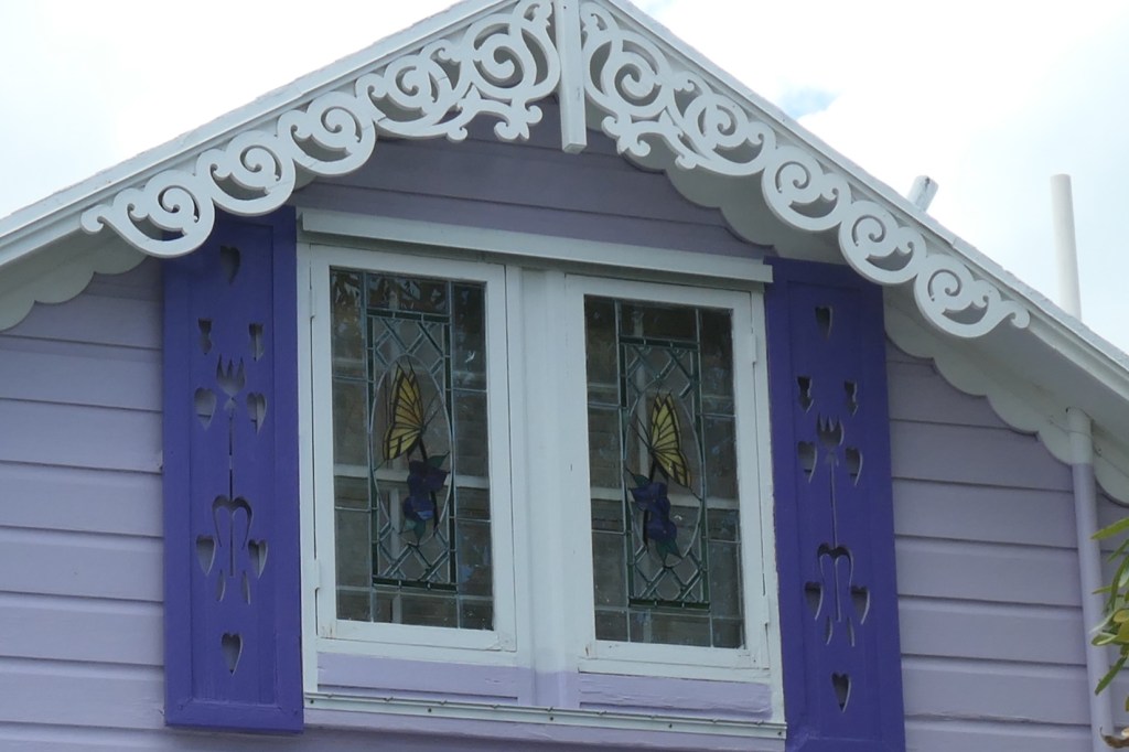 The lavender and white home with the lovely yard includes an extra surprise – check out the stained glass windows.
