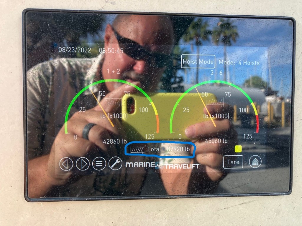 2. For the first time in our history with the boat, the scales on the lift crane were working! Yeah! Given her state of fuel and tankage, she weighs in at a svelte 87,100 pounds (or a trim 43.55 tons)! Valuable info for the future. We now know we can indeed be safely hauled by the more common 50-ton lift. And we photographed the proof for future use: