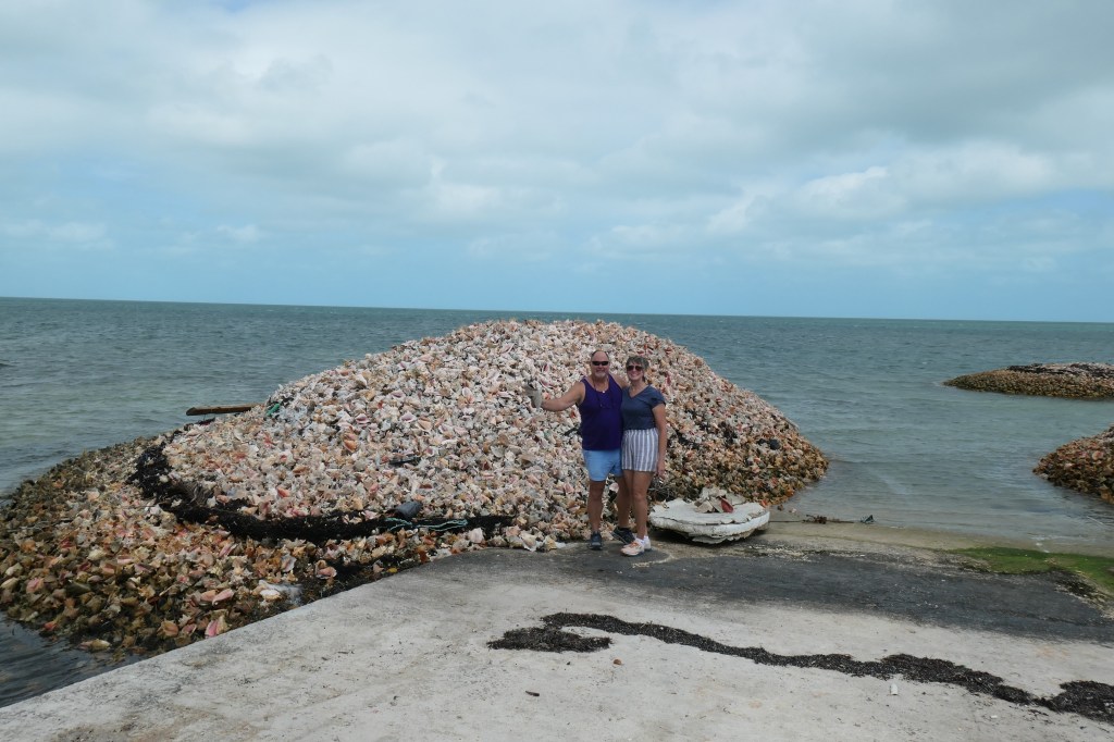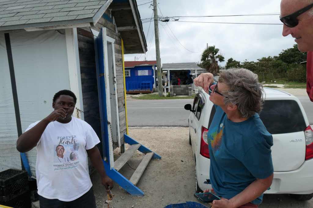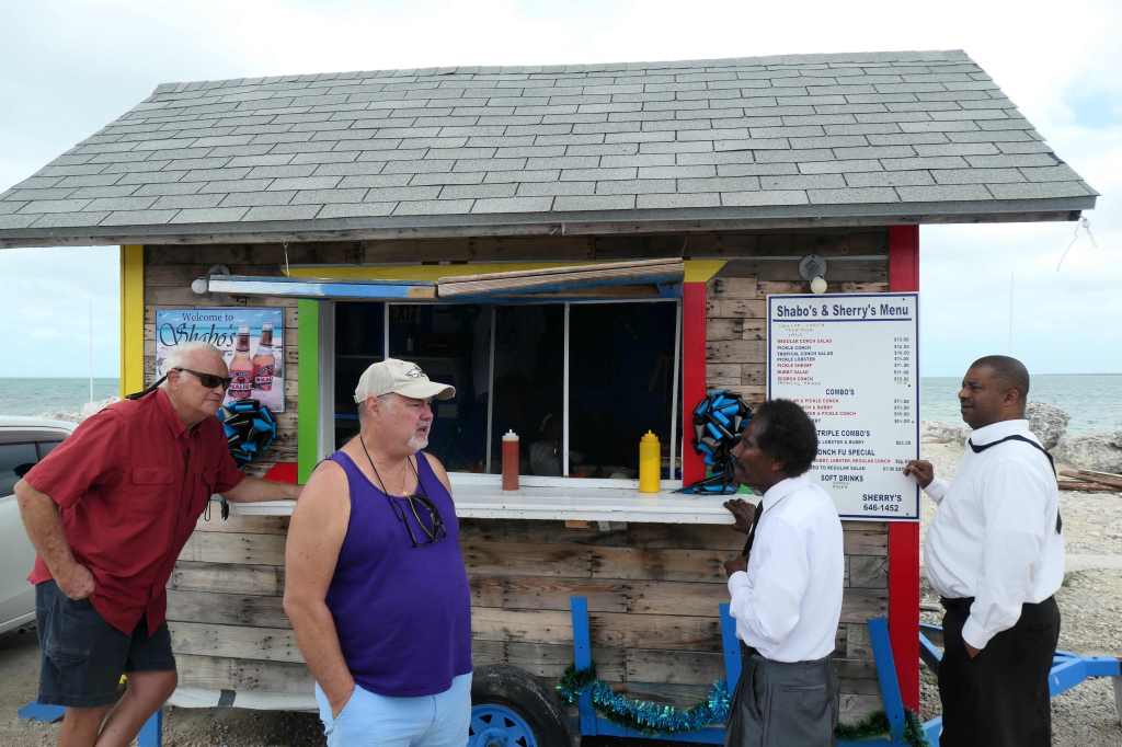 After more intense aerobics, I mean pedaling, we came to Shabo’s and Sherry’s, a delightful family-run conch stand in the West End Village. Feeling deserving of a treat, we stopped. (We stopped again. Yeah!)