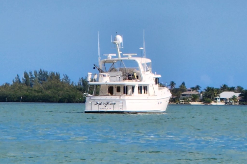 It was certainly not an ideal place to anchor, too far from any land for coverage, leading to a bumpy night. But everyone tried to rest. In the morning, the main engine still wasn’t starting. The new plan was to use the wing engine to slowly backtrack to the outer edge of the Little Bahama Bank where they would meet a tow boat for a trip to Old Bahama Bay Marina on West End. When it was time to raise anchor and get started, lo and behold, guess who was there.