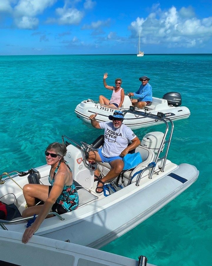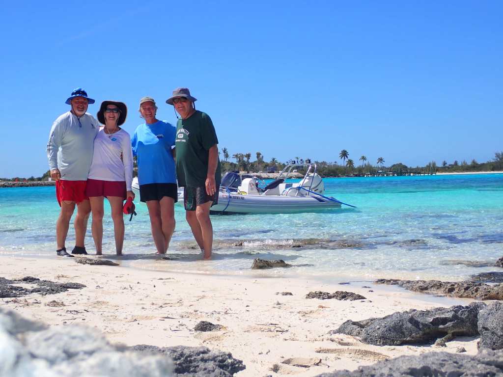 As we approached the southern anchorage on the way to the lower end of Normans, we saw a boat we thought we recognized. Got closer, and yep, it was Crossroads! We screeched the dinghies to a halt to say hello to Barry & Robin, who we last saw in Fort Pierce and Terry & Lynn had not yet met.