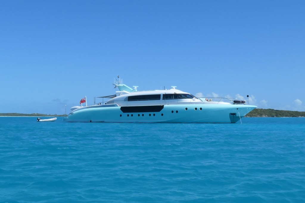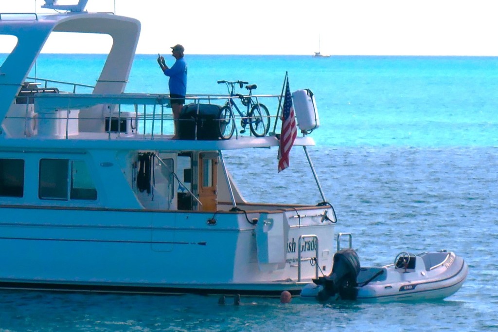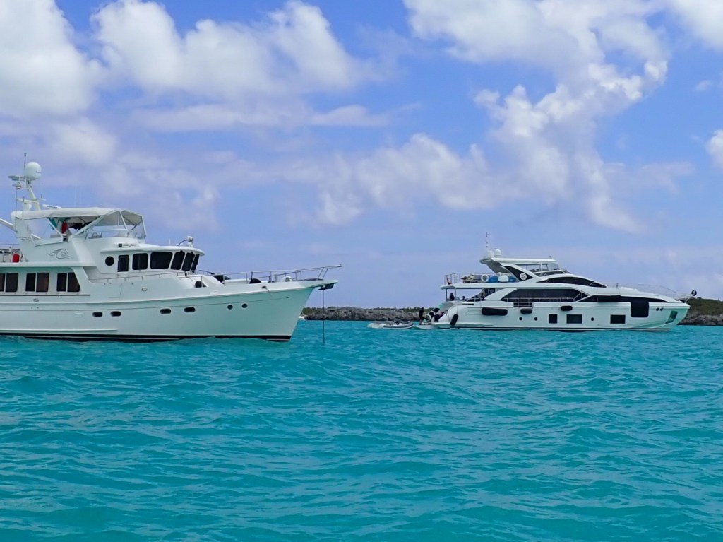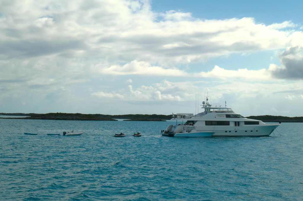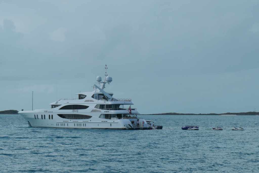 The Exuma Cays Land and Sea Park is a popular park, which means lots of visitors. Most common mode of transportation? Seems to be really big boats, for this is the land of the mega-yachts and charter boats. Shroud Cay was popular, with a dozen or so vessels less than 65′ on the mooring balls. Then you move out to the medium-sized (think 85-footers), and further out, the BIG boys…