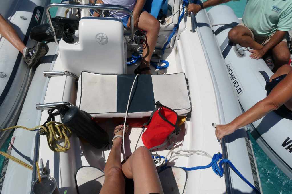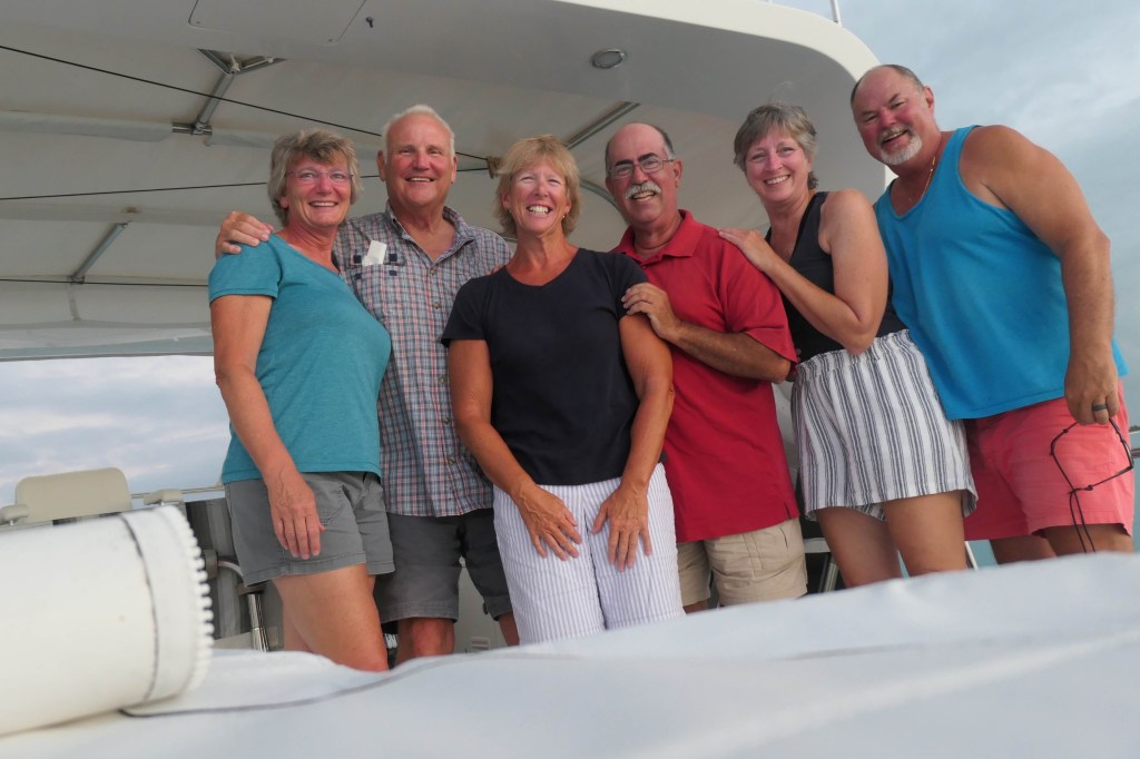 And speaking of catching up, this was a fantastic opportunity for a group chat. So, we rafted together on the dinghies, enjoying the sunny morning, and jibber jabbing. Naturally, Susie wanted a group photo, but no matter how high she stretched out those long arms, from her vantage point in the center, all she captured was partial people. No way to get everyone.