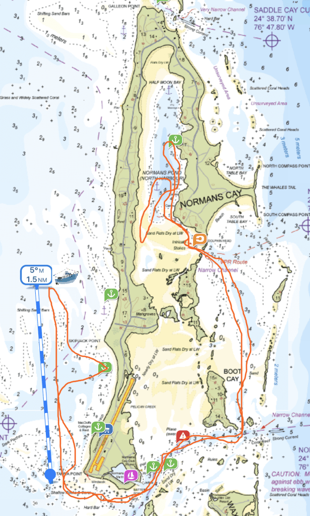 Having fun near Oyster Cay was good, but the ‘Mare likes to move, so off we go on the next voyage. Ah, well, actually, we just idled south about 7.5 nautical miles, taking 90 minutes to get there…. to good ol’ Normans Cay. It was a pleasant cruise, not in the least a “three-hour tour.” You might remember Norman’s history, named after a pirate, but made famous by the movie “Blow” about a massive cocaine smuggling operation. For those interested, check out this writeup.