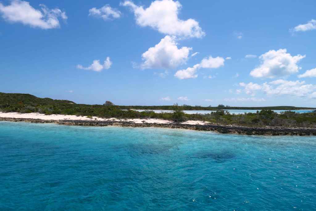 As you can see, Normans Cay is shaped sort of like an upside-down fishhook. Tucked in at the top is Normans Pond, only accessible by a very narrow cut of deep water. All the tan stuff is water less than 2 feet deep at low tide…