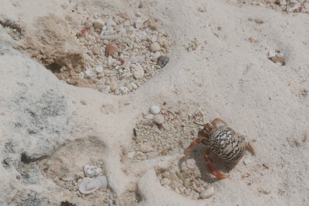 And a last anecdote: Susie had the shells (she’d carried around all afternoon) rinsed and laid out on the galley counter to get photos, make sure they were dry, etc. During the night, she was awakened by a strange, soft sound, like something falling to the teak floor. After hearing the sound several times, she went to investigate. When she stepped from the stateroom to the area at the bottom of the stairs near the engine room door, she stepped ON something in the dark. Uh oh. FLIP on the lights! Indeed, one of those tiny “shells” had crawled to the edge of the galley counter, fallen to the floor, made a poor choice of direction and crawled to the stairway, and fallen stair by stair to the lower level. Poor little thing. Ultimately, he then went flying and swimming. (“They’re coming to get you, Barbara.” There’s another old reference. Who’ll get that one?)