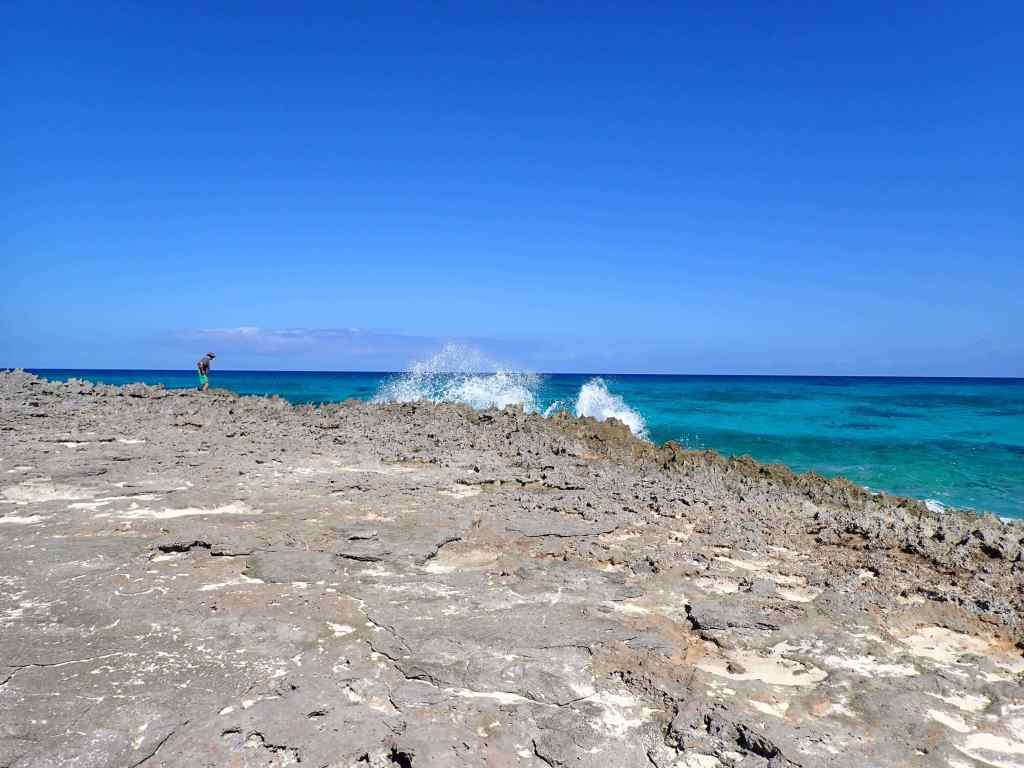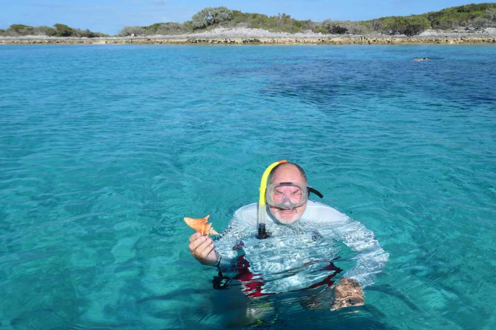 Next, we ranged south looking for deserted beaches and spotted one over on Long Cay. Pretty sand it was, but also marked “Private” and even had a big dog that came up to yell at us. So, we moseyed a bit more east in Spirit Bay to find this craggy, iron-shore-y “beach” just to get ashore. And WOW, we came ashore in a conch nursery! Hundreds of small conch – they were everywhere! Many had been “caught” in small shallow pools as the tide went out. Todd and Terry must have tossed a hundred or more back into deeper water. Silly guys! We made our way through a little sand and across this narrow part of Long Cay to see the Exuma Sound, which crashed against the iron shore.
