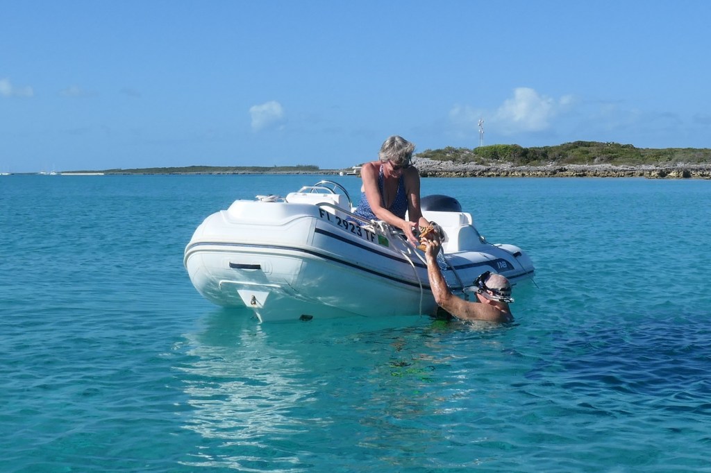 Nearby beach combing options having been eliminated, we headed home. On the way, we crossed over a large area of coral just in front of the boats. The guys grabbed their gear and jumped in. Where we’d anchored was a bit of a throughfare for several tour boats that came roaring by twice a day, so the ladies stayed on the dinghies with the dive flag as targets, err lookouts.