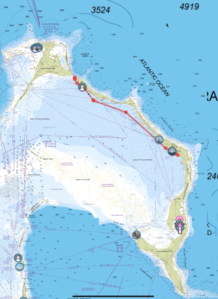 Accurately predicting weather and sea state is a crapshoot. We picked Thursday to make the 40nm+ run across the Exuma Sound from Rock Sound to the top of Exuma. The wind was at our back all the way. We were headed west, and so was the wind. Sounds good, right? Well, we’ve mentioned “fetch” before, as basically the longer the distance of water upon which the wind blows, the greater the effect. So, you guessed it, having the wind at our back meant the closer we got to our destination, the “sportier” it became. The last 3/4 of a mile was a doozey! Something all parties do not want to experience again!