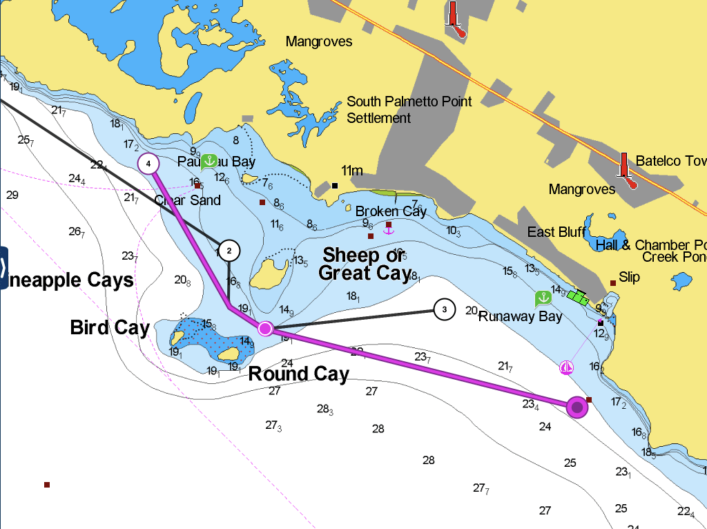 From the top of the chart to the bottom is about 2.5nm, so not a real long trip but not a short jaunt. The small depth numbers are in meters at mean low tide. And you can see our last stop in Spirit Bay on Long Cay at the bottom before we returned to the boat through the real shallow water.