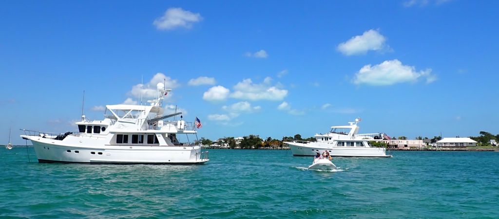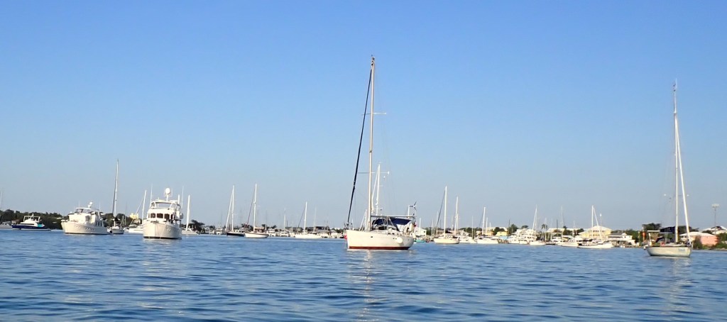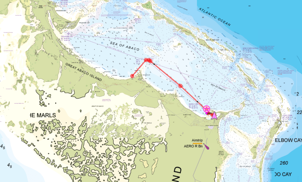 Some of you might be old enough to remember the commercial with O. J. Simpson racing through the airport, jumping over things to make his flight. Well, this wasn’t like that. Sure, we were anxious, made worse by a change in wind direction Sunday night that made things even more sporty in Red Bay. We stuck it out for most of the morning to (hopefully) allow time for some of the boats anchored in Marsh Harbour to (hopefully) move out. At 1100, we donned our life jackets against the sway and bobble, then weighed anchor and crossed our fingers (and toes for good measure).