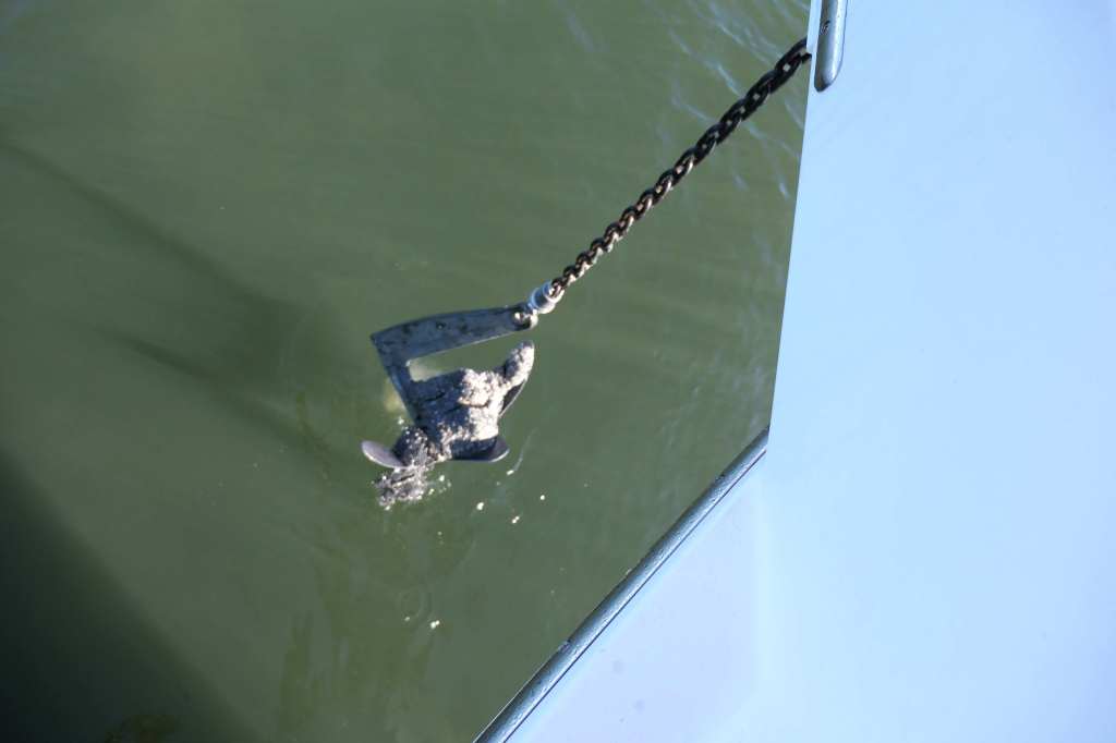 With the cool, stormy breeze, we spent a peaceful night anchored where we’d wiggled in between the crab pots. This morning we discovered that the anchor had indeed held very well. It was holding so well in fact that it was a bit of a struggle to raise it. When it cleared the surface, we saw why. The anchor came up carrying a large mass of dark mud and small stones stubbornly clinging to it, rather like wet, sticky Quikrete. Yuck!