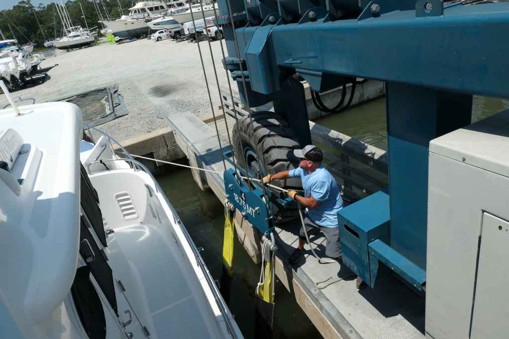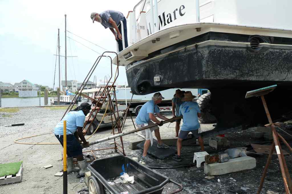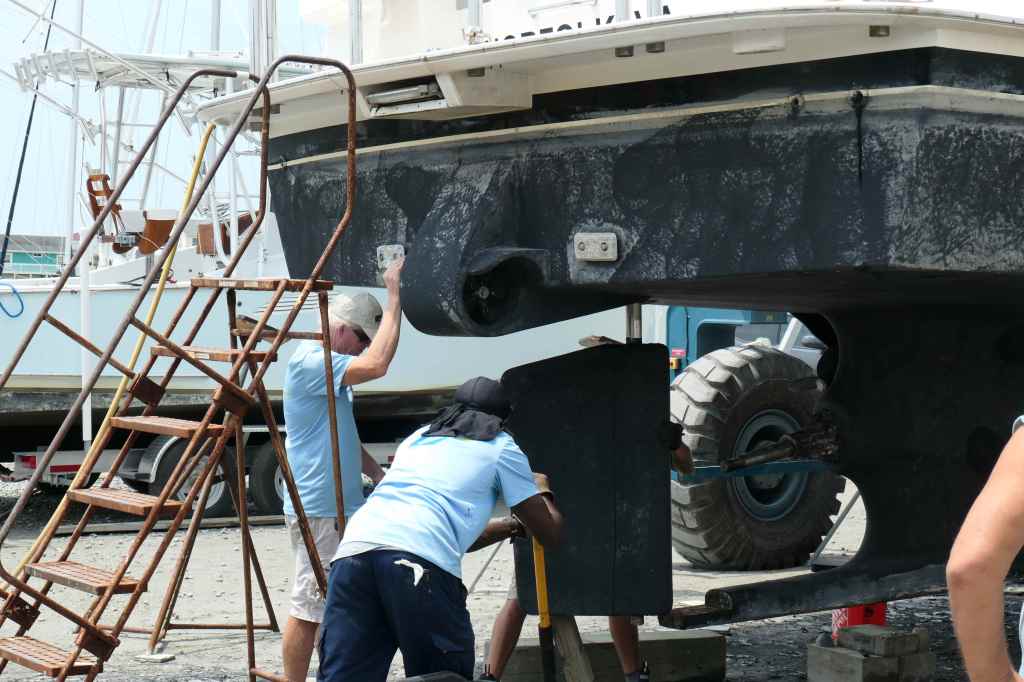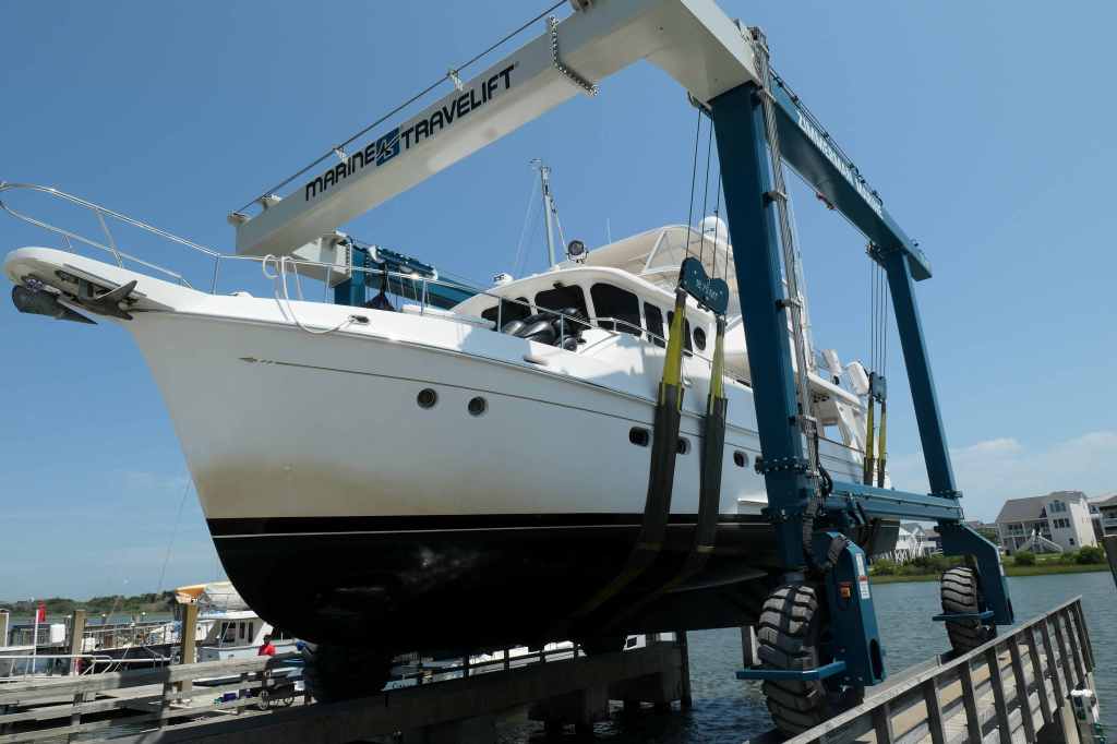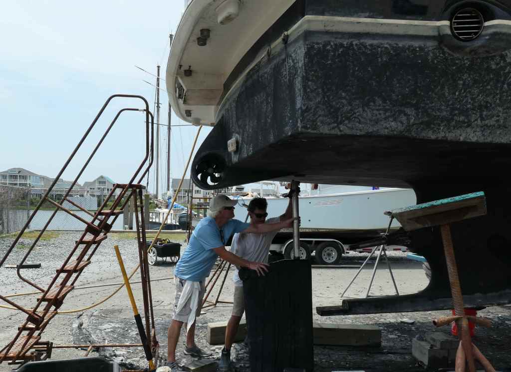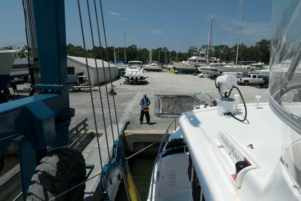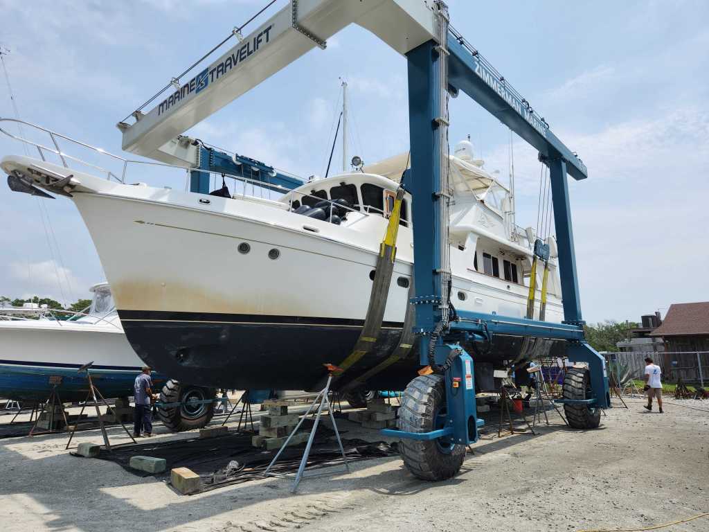 We arrived at Zimmerman Marine Holden Beach on June 22, anticipating (hoping for) a simple alignment issue. The initial trial run and subsequent alignment checks in the engine room showed we were aligned. No joy. That was not the cause of the vibration. Next step, we had to come out of the water for further diagnostics.
