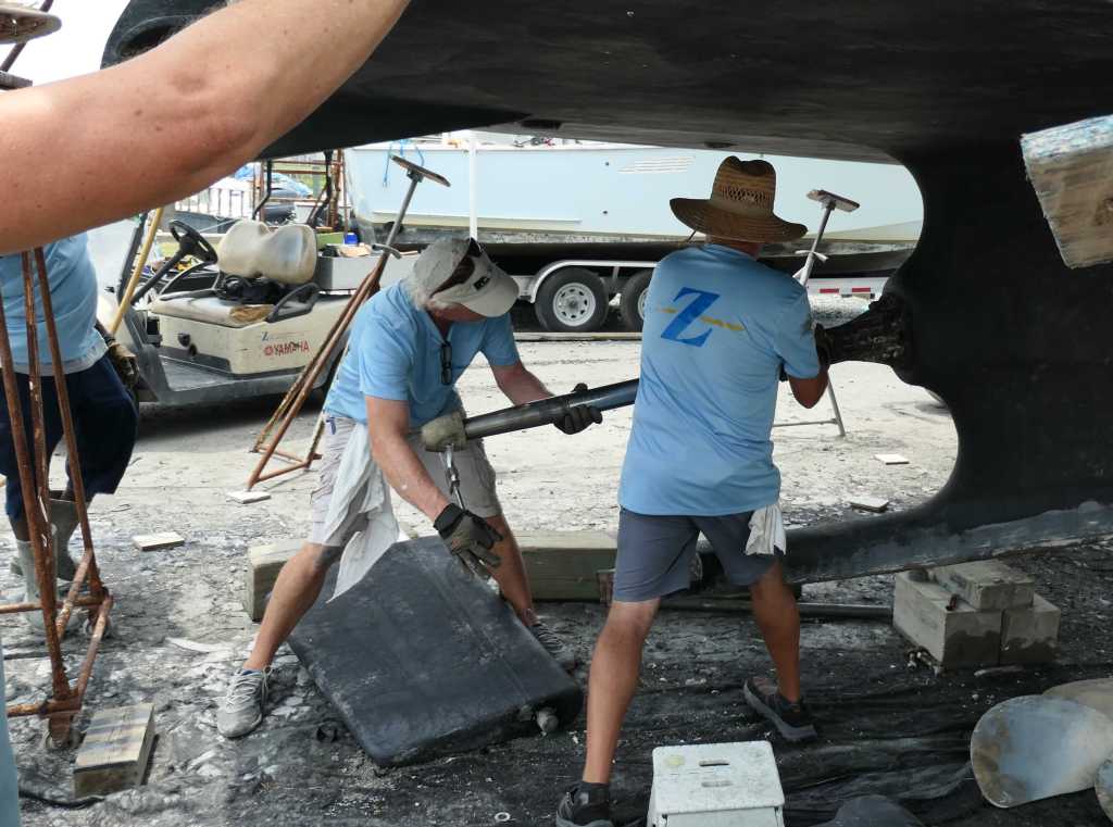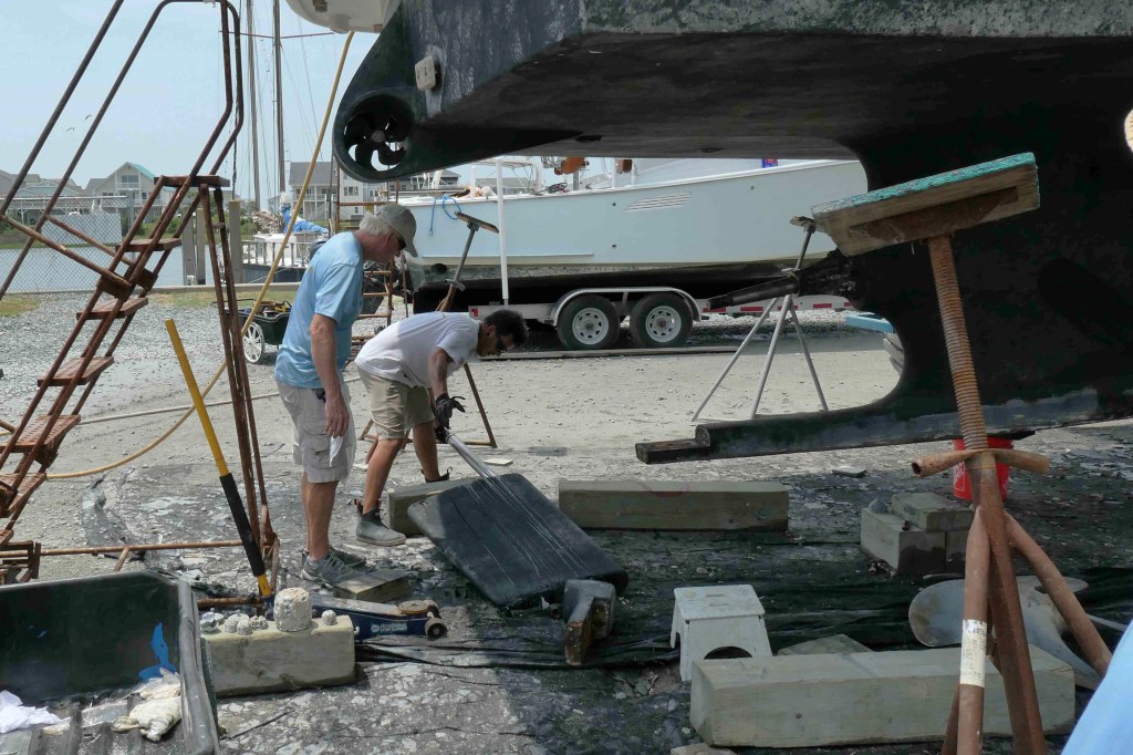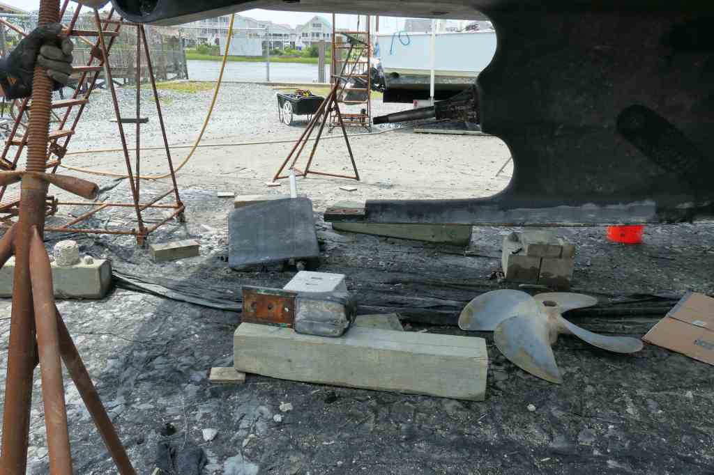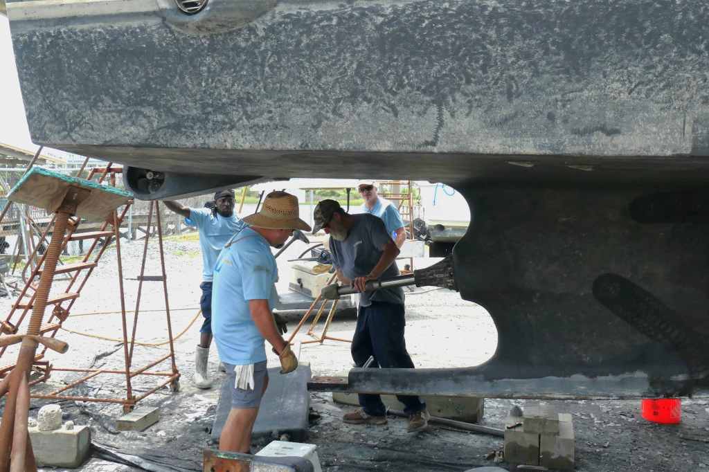 With her line cutters, prop, shoe, and rudder removed, it was time for the task of pulling the awkwardly long and heavy shaft, 2 3/4″ thick, 14 feet+ long, and about 300 pounds!