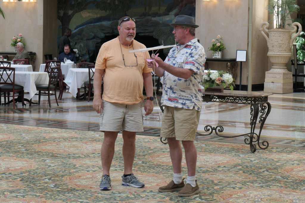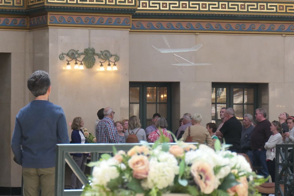 We stayed in the area to see the ultra-light indoor planes. The boom was there a few days before to install plastic in the upper atrium framework so the little planes wouldn’t get stuck. These 12-inch to what seems like 2-foot- long planes are literally “light as a feather,” made of very, very thin balsa wood, super thin mylar, and a rubber band. Given the right bend of this or that, the idea is to release it and see how long it can stay afloat. Ten minutes? Sure, no problem. The bigger ones, close to thirty minutes! Some made it all the way to the top to whack the dome before slowly circling back down. Here’s a link for those interested: just released…