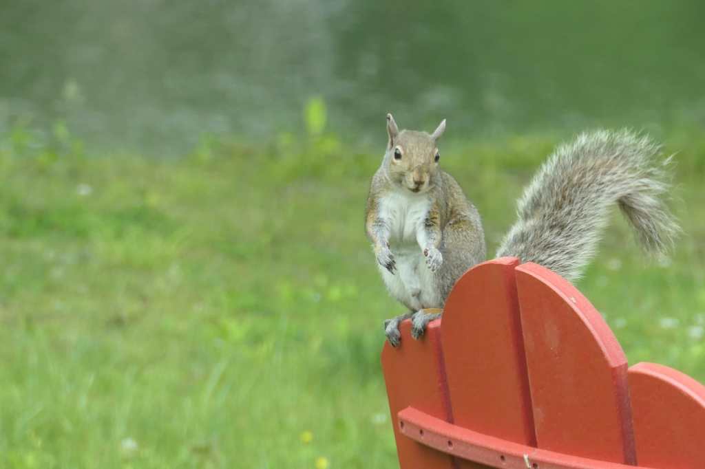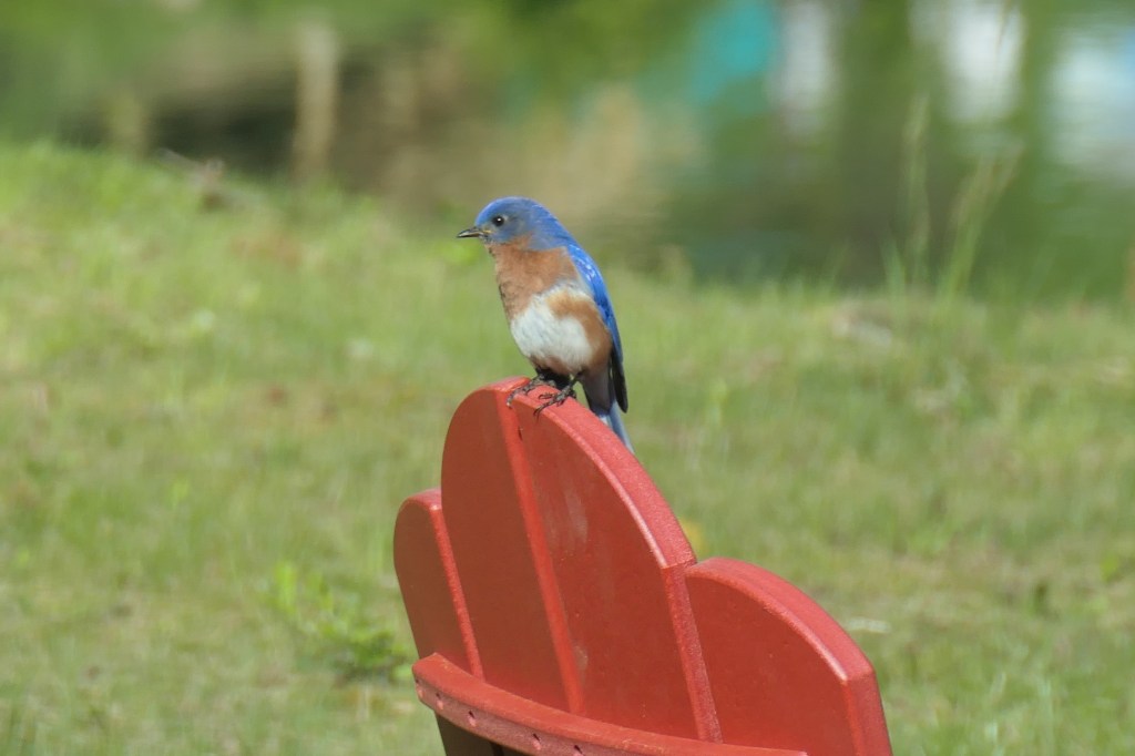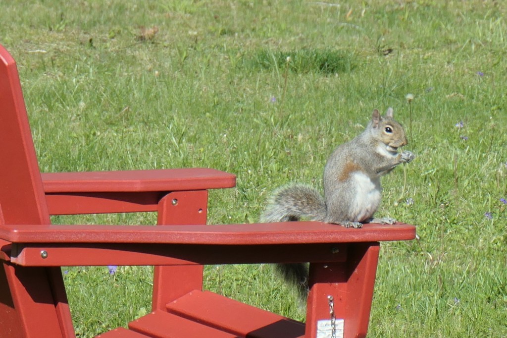 The red chairs make for a great backdrop. You have to clean them before you can sit in them – [Yuck] – but they provide good contrast for the photos. For some reason, we haven’t taken pictures of the cardinals, the catbirds, at least five(?) different finches, and so many others. Just these silly squirrels and, oh the lovely bluebird boys!