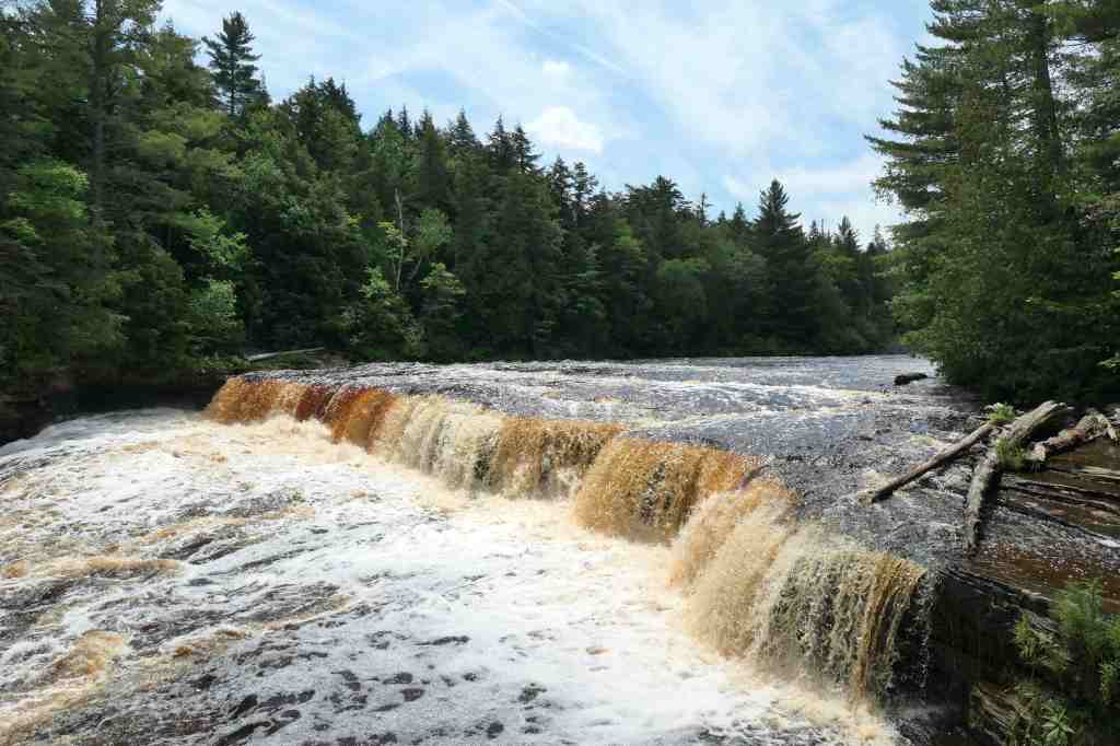 The Lower Tahquamenon Falls splits into two halves each more than 100 feet wide and 22 feet tall.