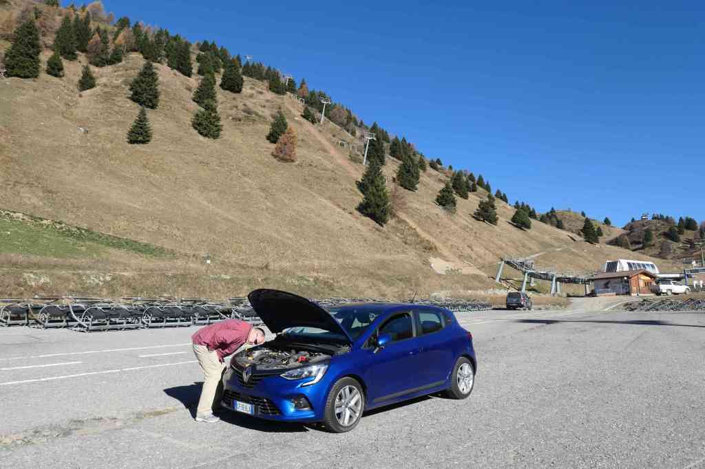 No worries, we had our resident mechanic, Todd. Radiators being the same in any language, we waited for things to cool down and fortunately located the blown radiator cap in the engine compartment! Hmm, now we needed water, and we just happened to have most of a 1.5-liter bottle Susie had brought with us. Into the radiator, it went (yeah!), and we were back on the twisty road with fingers crossed and those praying hands folded, hoping to make it off the mountain and to Trento before dark. (Susie, you can stop hyperventilating now.)