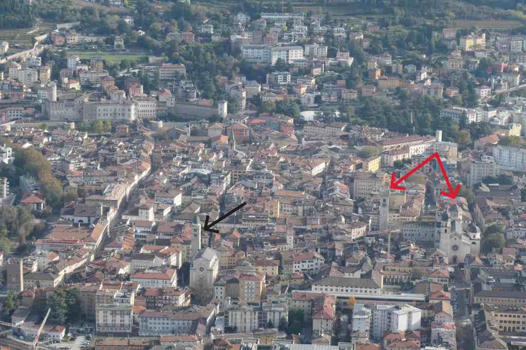 The black arrow shows the distinctive tower of the Church of Santa Maria Maggiore, behind which is the small B&B (not visible). The red arrows show the L-shaped Cathedral of San Vigilio. Now look back at the other shot – bet you can find it.