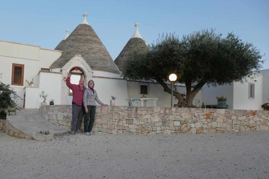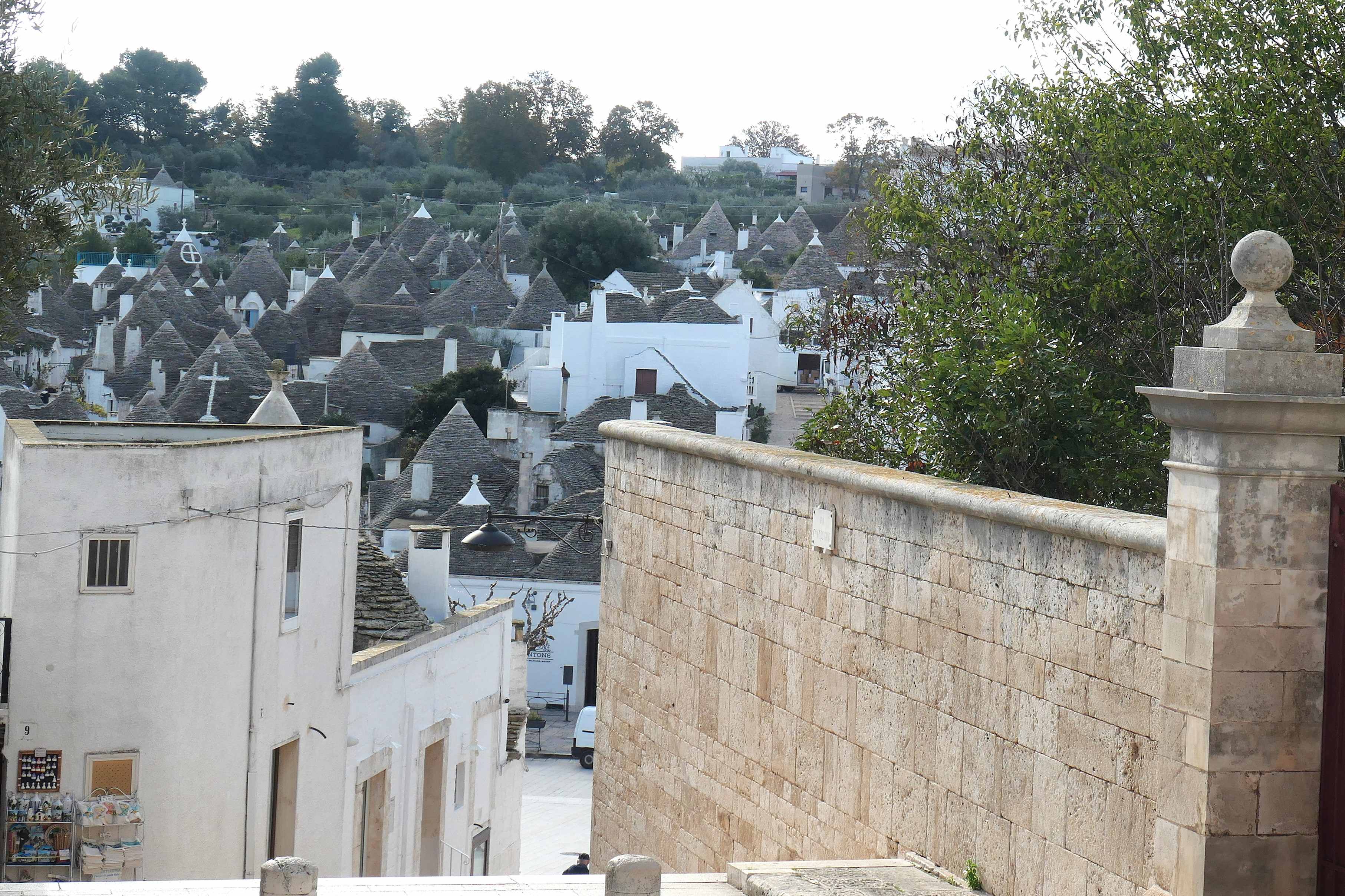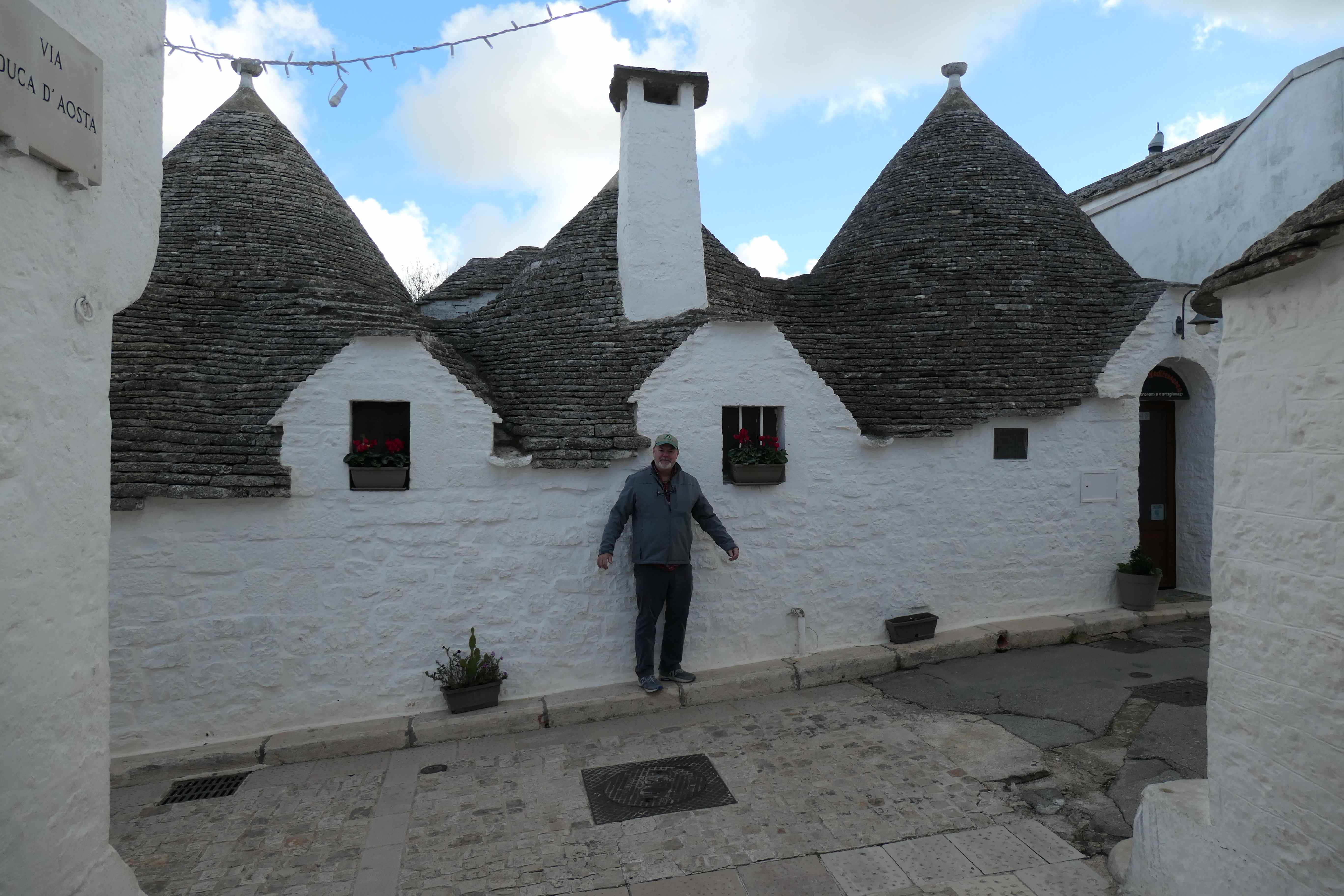 Specific to the Itria Valley in Puglia, trulli (plural of trullo) are dry-stacked stone huts with walls exceeding three-feet thick and double layer conical stone roofs. Originally built as temporary field shelters or, as in Angelo’s case, storehouses for grain, they became simple, efficient homes that could be enlarged as the family grew or “easily” torn down when the tax inspector was in the area. The rooftop pinnacle stone represented the signature of the stonemason and that the trullo was finished and now occupied.