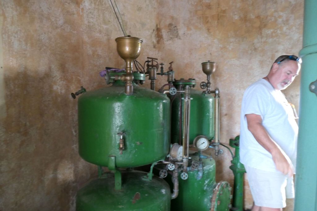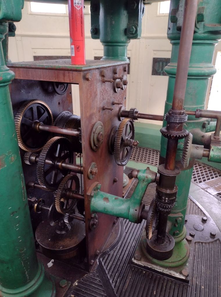 The lens and turning equipment are still in place today. The lighting source is a 325,000 candlepower “Hood” petroleum vapor burner. A hand pump is used to pressurize the petroleum (kerosene) which is in the heavy green iron containers below the lantern room. The fuel travels up a tube to a vaporizer in the burner which sprays into a preheated mantle. (Yep. Just like a giant Coleman lantern!) The Fresnel lens concentrates the mantle’s light into beams that shine straight out towards the horizon, rather than up, down, and all around like a camping lantern.