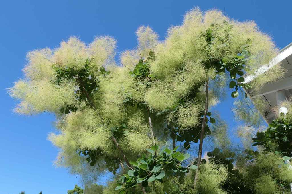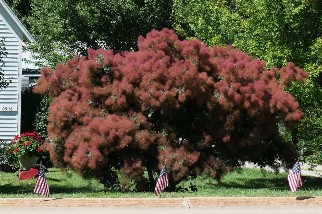 The fluffs eventually turn bright red, then fall off & blow down the street like little tumbleweedsThere’s a much larger one across the street that’s already turned redSmokebush Trees – Very interesting!