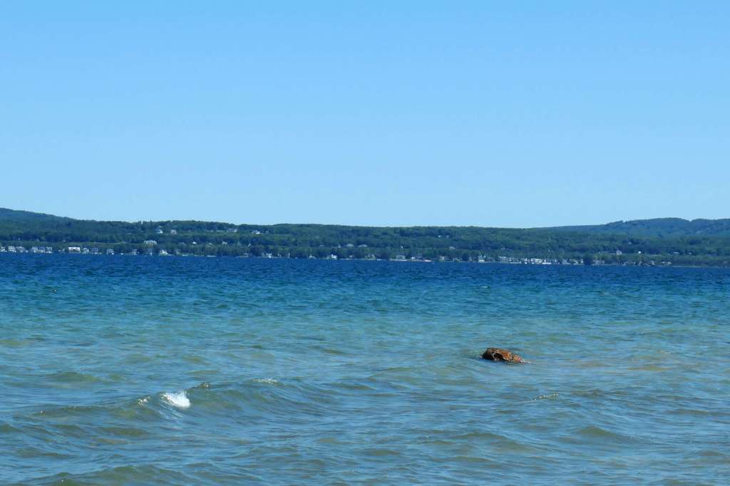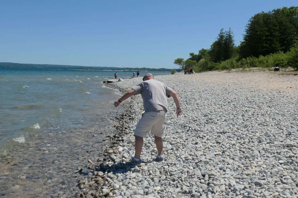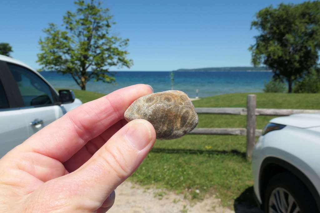 After leaving the general store, Susie requested a snack stop at the nearby Magnus Park in Petoskey. Todd sensed an ulterior motive more so than treats but went along with it anyway. W-e-l-l, since we’re here, Honey, we may as well spend some time rock hunting. 🙂 Look, several people have buckets of Petoskey stones! How hard can it be?